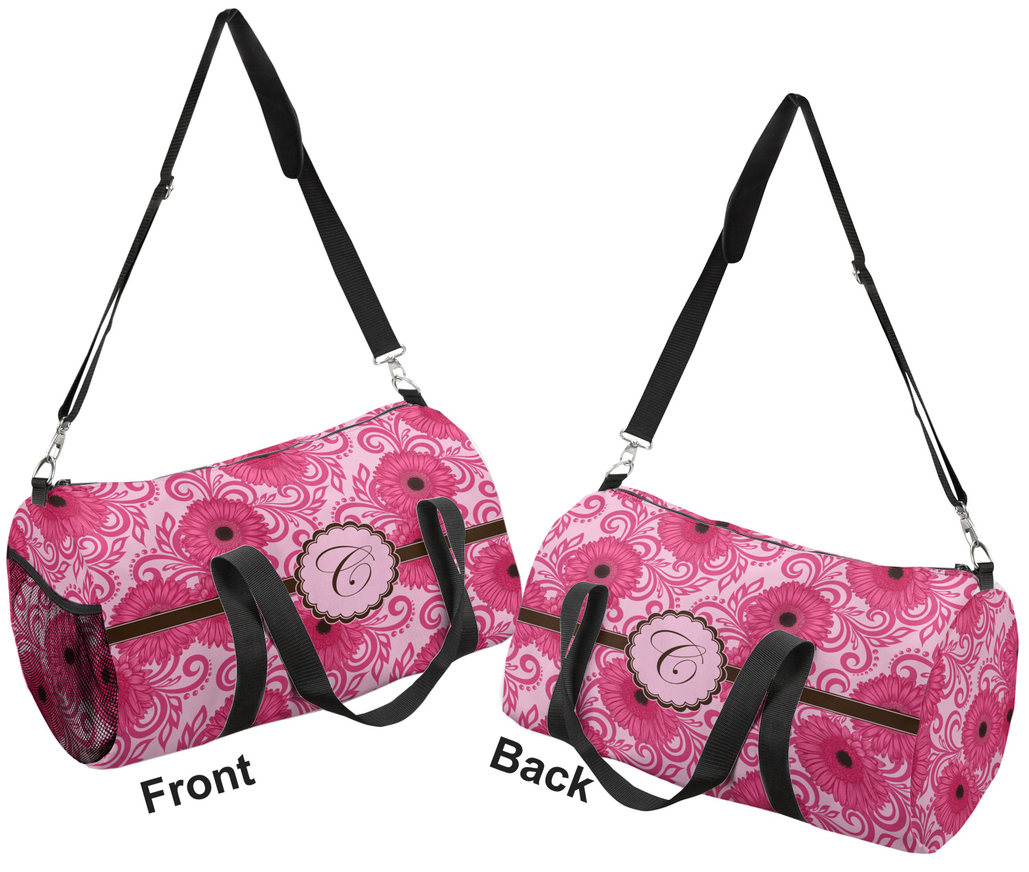 This duffle is a sturdy bag made of a canvas material. It comes in two sizes: Small (19"W x 9.5"H x 9.5"D) and Large (23"W x 12"H x 12"D). The bag is a cylindrical shape with a black adjustable strap and two handles. On one side is an elastic pouch to put a waterbottle or other small item. Your product will be sublimated with your design and is able to be designed on the front, back, and sides. Be sure to remember that the straps may cut into parts of your design if you upload your own artwork.