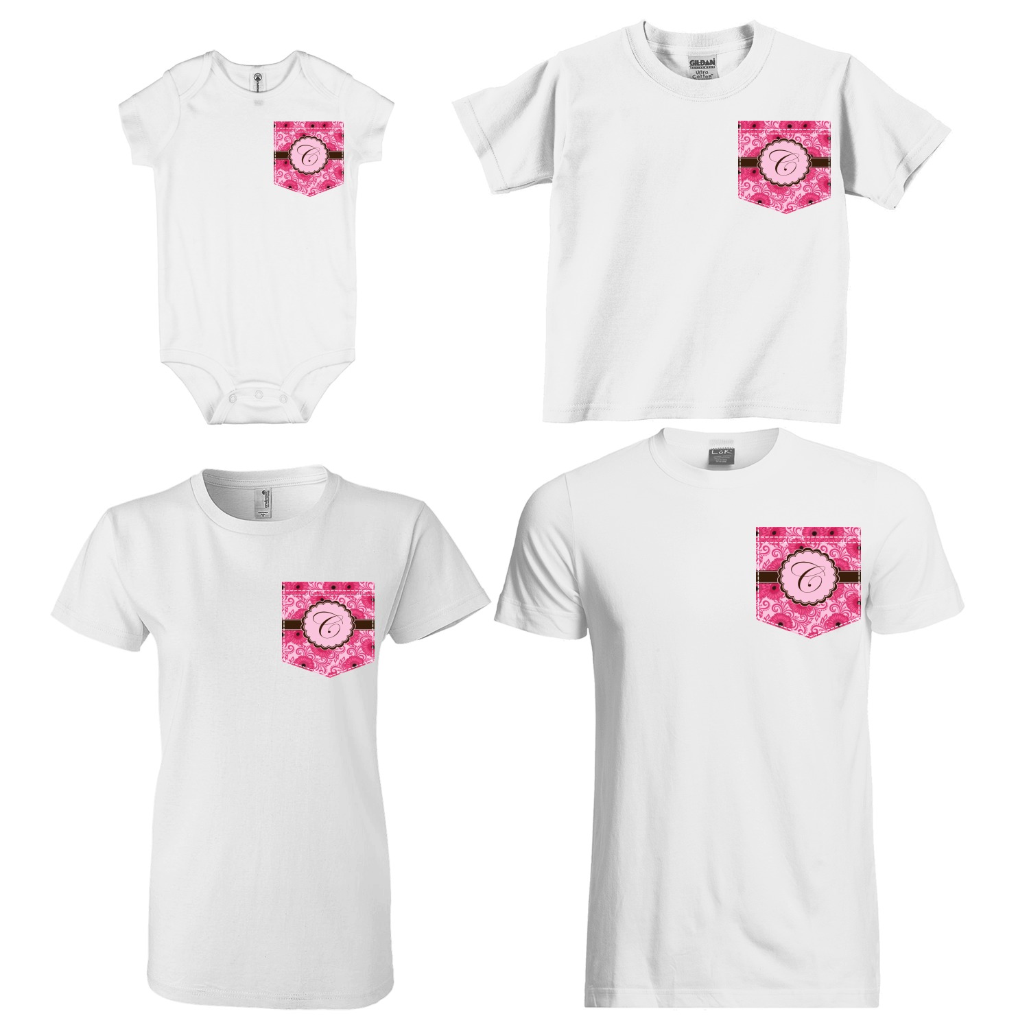 The faux pockets are available in 4 different sizes - for baby, kids, youth/women & men; the whole family can have the same pocket design, but sized just for them! The pockets are printed using our direct-to-film technology to the exact shape & size. We have faux stitching around the pocket, with double stitching on the top of the pocket to give it the authentic pocket look!