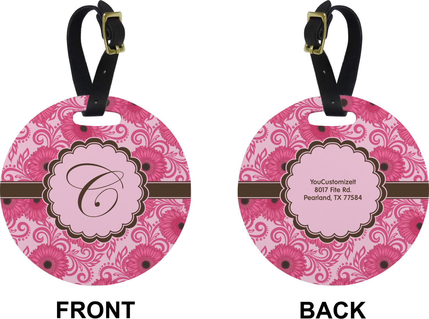 These personalized bag tags are sold in a variety of shapes, so that you may find the product that meets your vision exactly. We sell a round luggage tag, which measures at approximately 4" x 4". Our square luggage tag is about 3.5" x 3.5", while our rectangular version is 2.75" x 4 ".