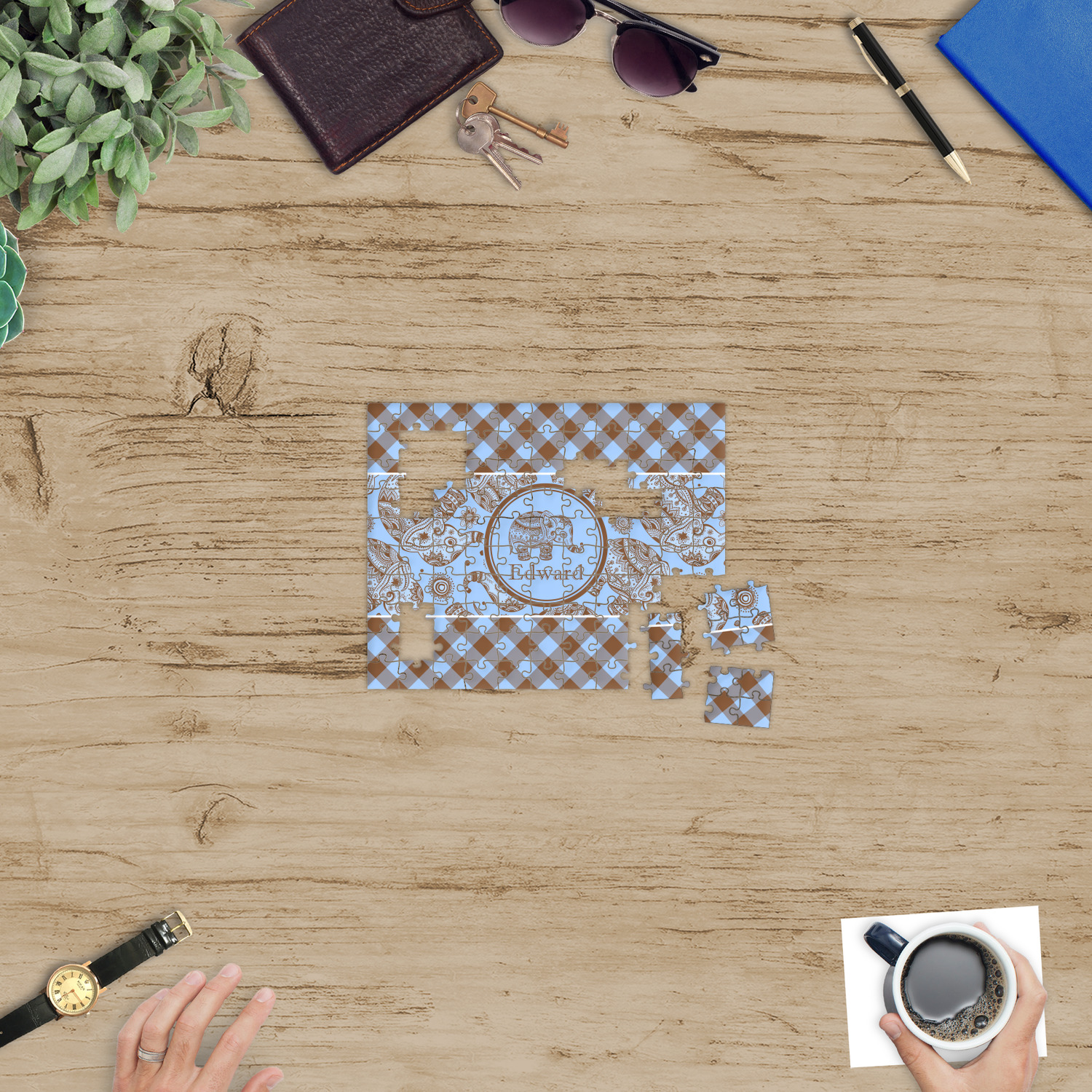 Depending on the look you are trying to achieve, you can add; a thematic pattern or background, with a photo in a frame and text or personalization to your puzzle. Basically if you can imagine it, you can design it!