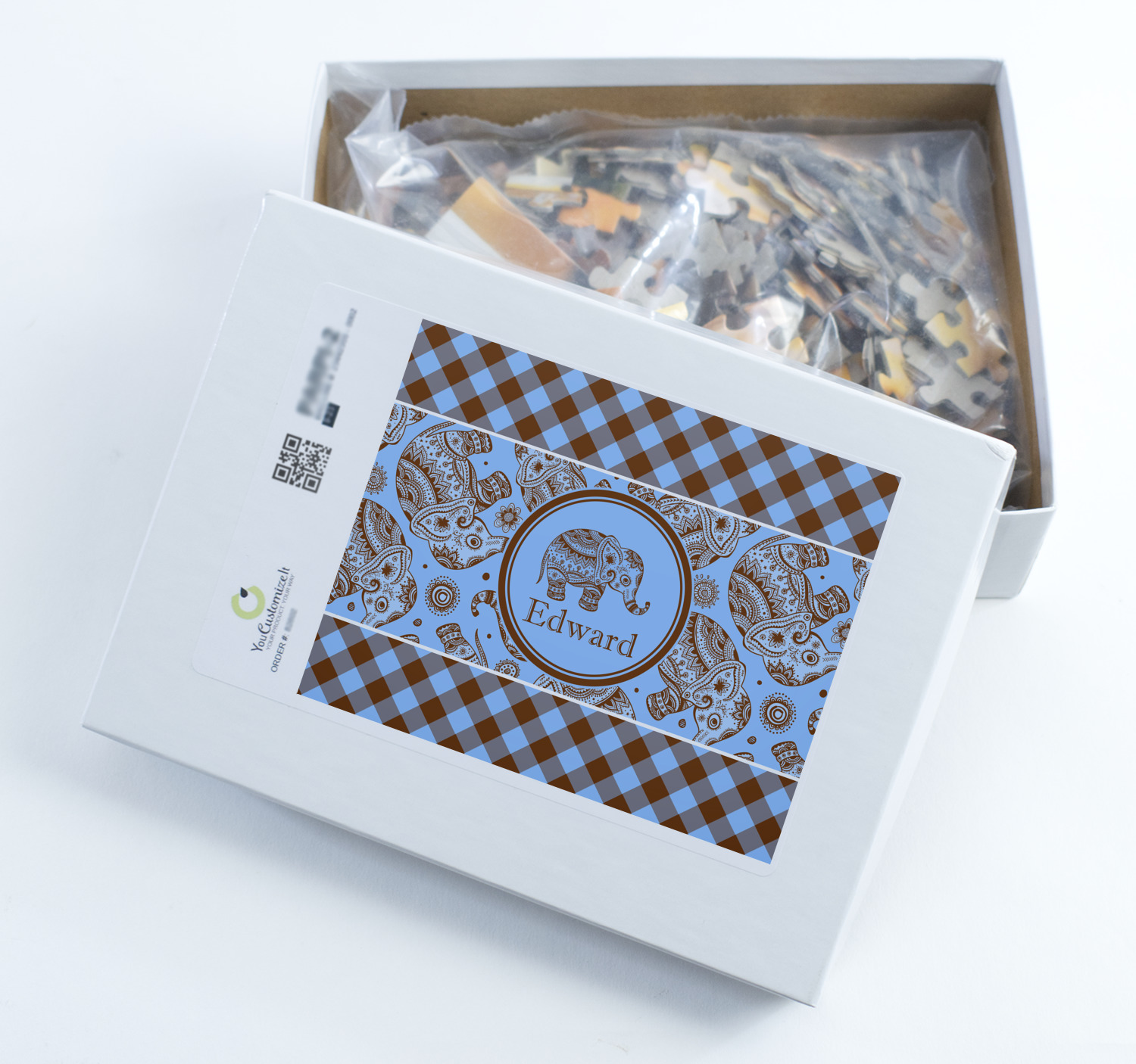 You can also upload your logo or art that you or your kids drew. To create more challenging jigsaw puzzles, you can create a pattern from with your logo or artwork. You can also add other elements such as text or personalization.