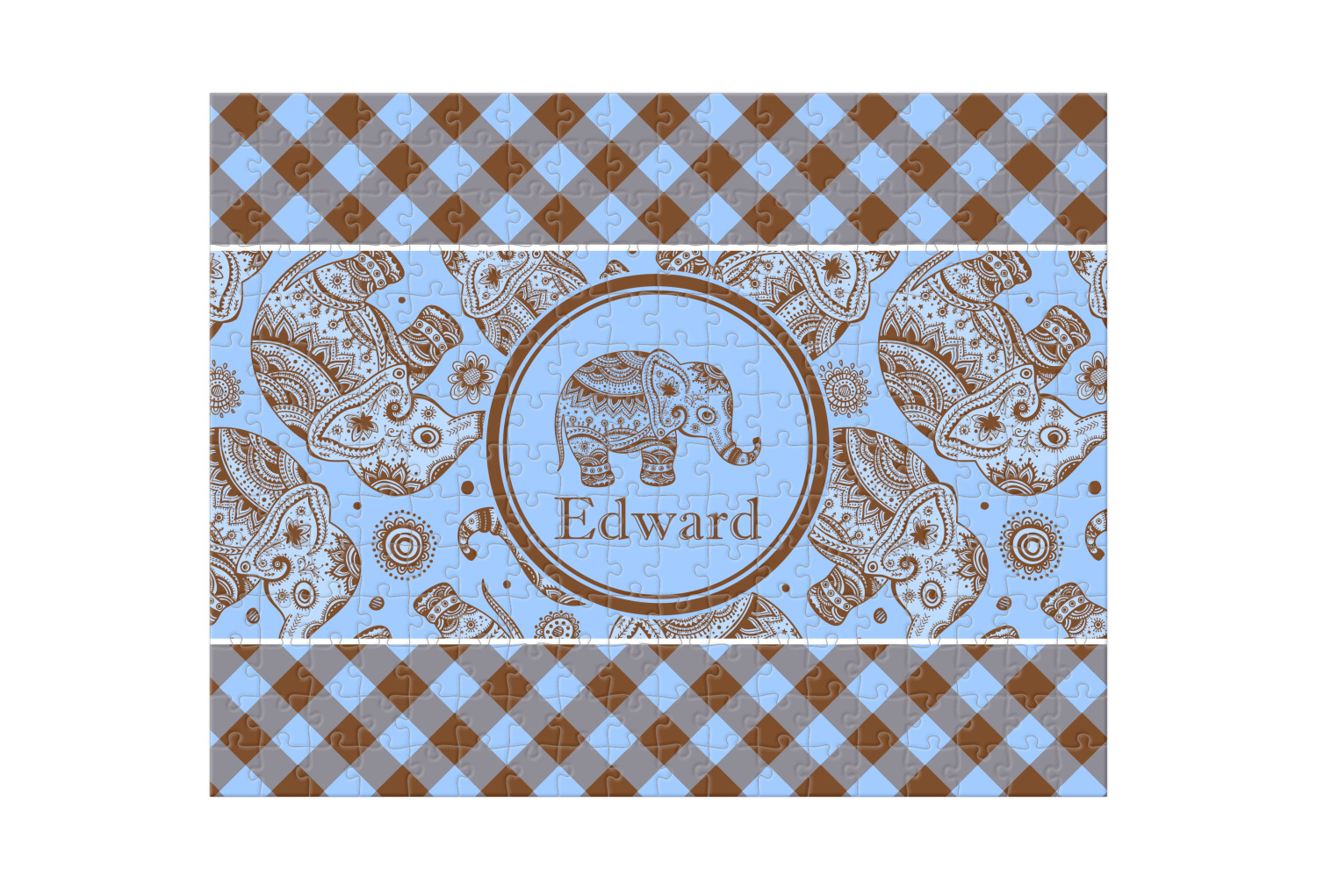 This design with gingham and baby elephants is elegant and versatile. We chose to use baby blue and brown for our colors, however the design is fully recolor-able; so you can change the both the colors to any color combination that you like.
