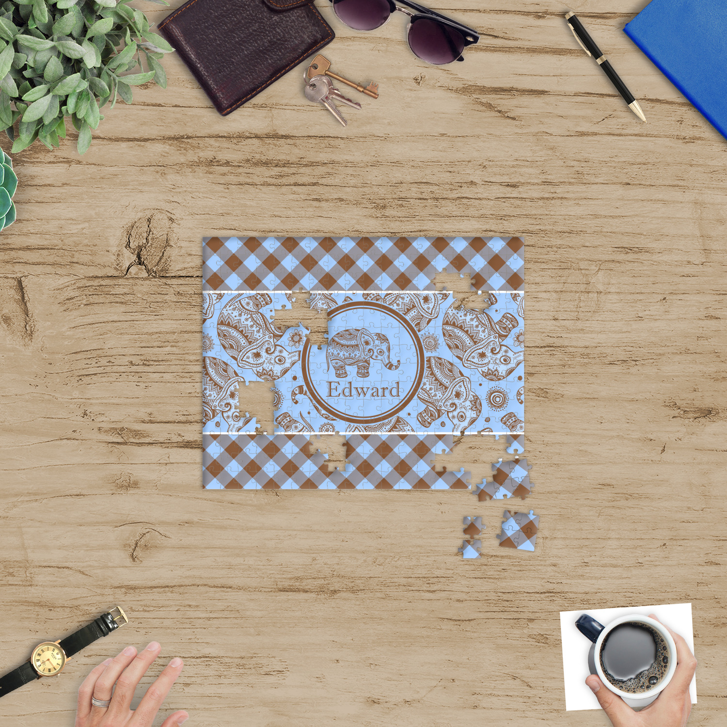 Depending on the look you are trying to achieve, you can add; a thematic pattern or background, with a photo in a frame and text or personalization to your puzzle. Basically if you can imagine it, you can design it!