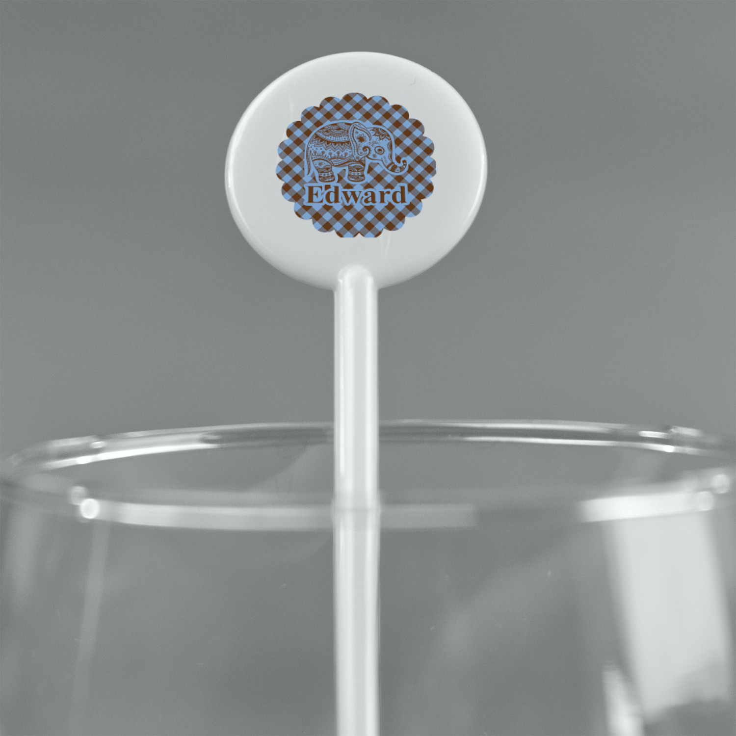 We chose the angled gingham for the top and bottom, but you have the choice of straight gingham or any other pattern in our system that you like. Our baby elephant pattern are available in 3 different styles - we chose style 2. We opted not to have a ribbon and chose a simple round label with a graphic of the elephant and the personalization below the elephant graphic.