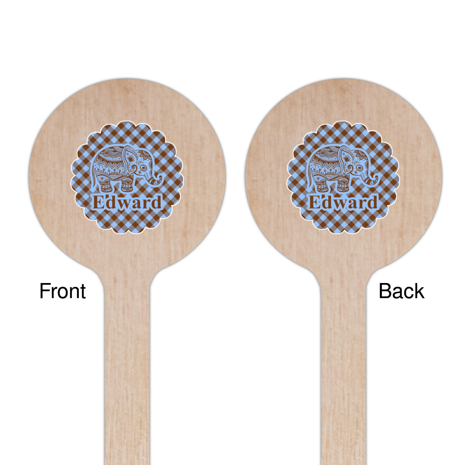 We chose the angled gingham for the top and bottom, but you have the choice of straight gingham or any other pattern in our system that you like. Our baby elephant pattern are available in 3 different styles - we chose style 2. We opted not to have a ribbon and chose a simple round label with a graphic of the elephant and the personalization below the elephant graphic.
