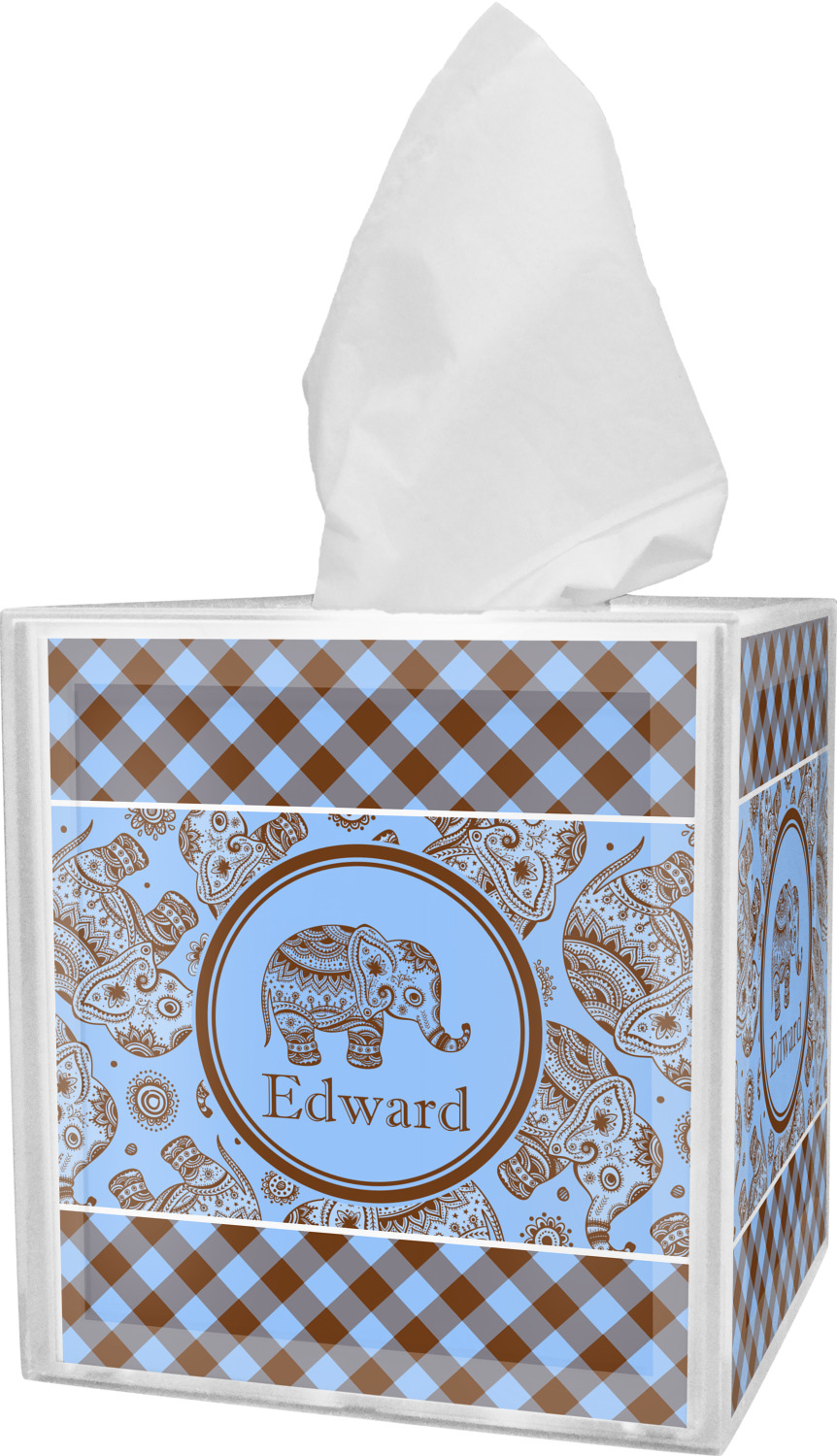 These tissue holders are built from durable acrylic and display your unique personalization on fine-quality vinyl inserts placed within the four sides and top. The box features two pieces, allowing you to easily switch out tissue boxes. On the sides, you'll find ridges that ensure the top and base fit securely in place. The bottom of these tissue box holders has four, rubber, non-slip pads to prevent the box from scuffing any surface you decide to display it on. Each box can fit a standard 5-by-5-inch box of tissues.