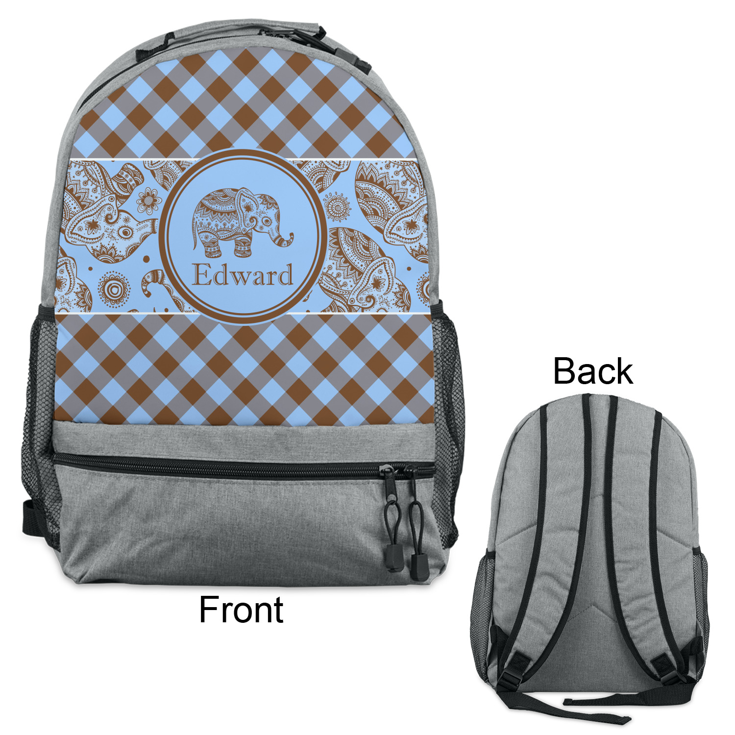 We chose the angled gingham for the top and bottom, but you have the choice of straight gingham or any other pattern in our system that you like. Our baby elephant pattern are available in 3 different styles - we chose style 2. We opted not to have a ribbon and chose a simple round label with a graphic of the elephant and the personalization below the elephant graphic.