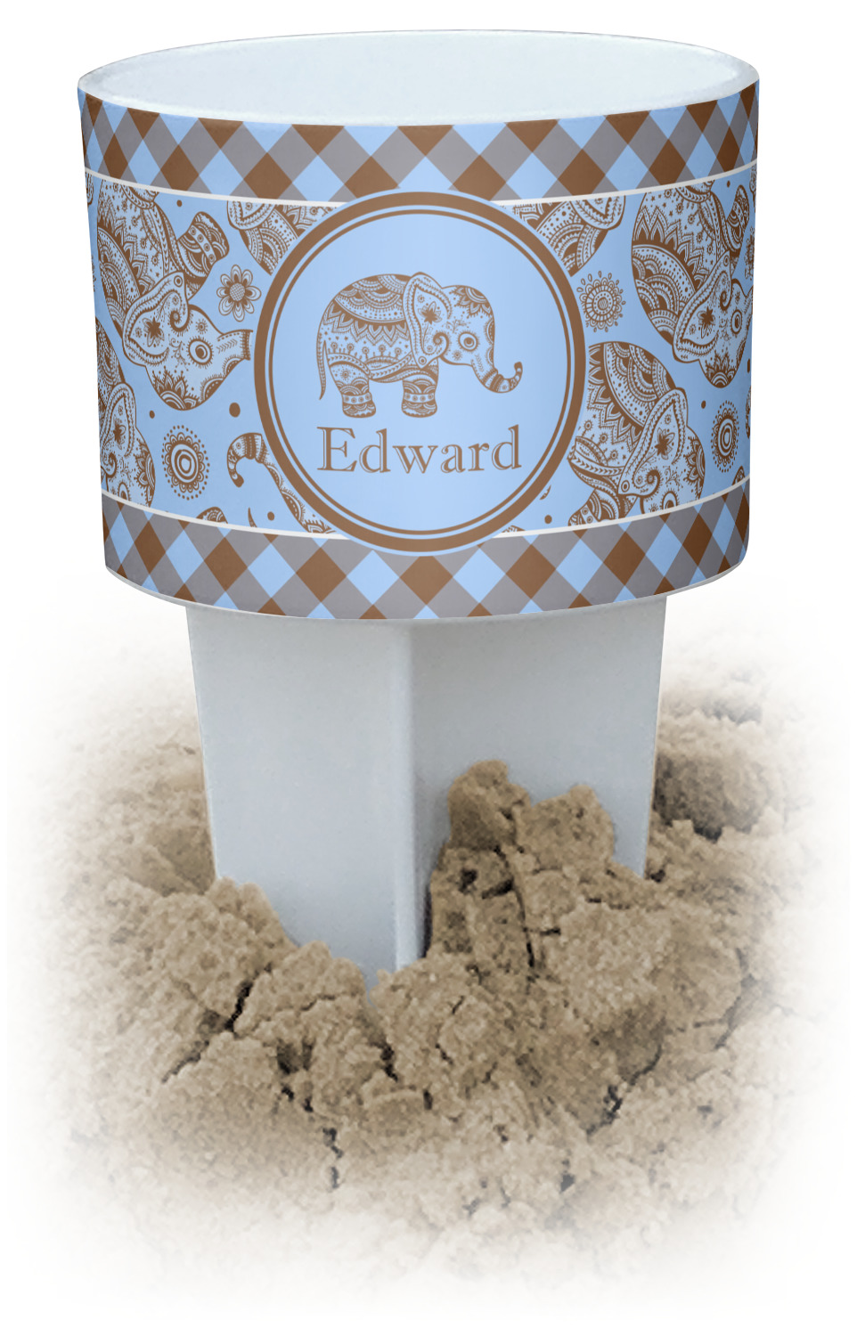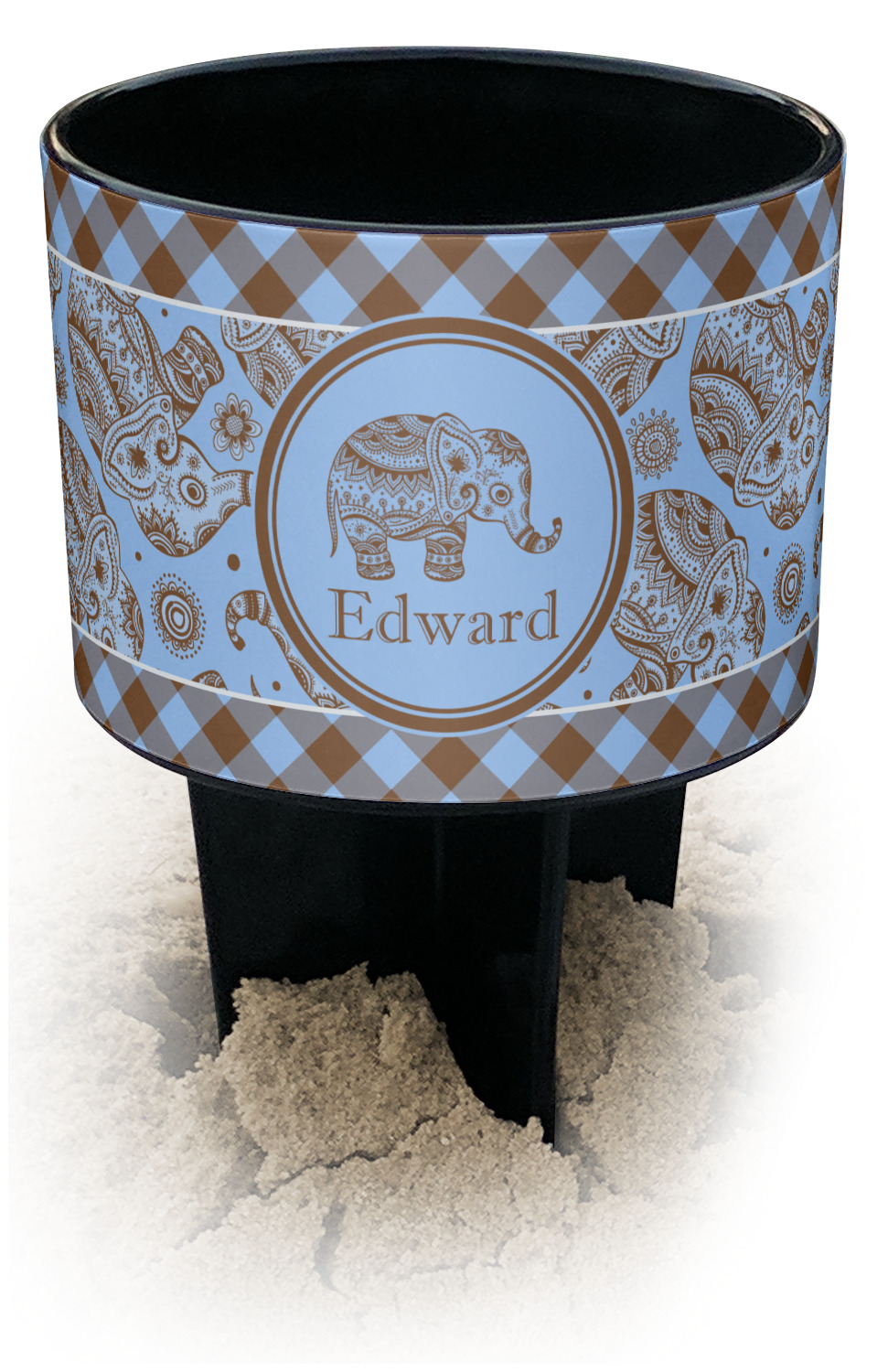 This cup holder has a large stake at its bottom that anchors it to the sand or ground below, while the cup holder rests above the stake. The entire drink holder is made of durable plastic and displays your customization around the cup holder portion. We sell these personalized beach spikers in two different colors: black and white.