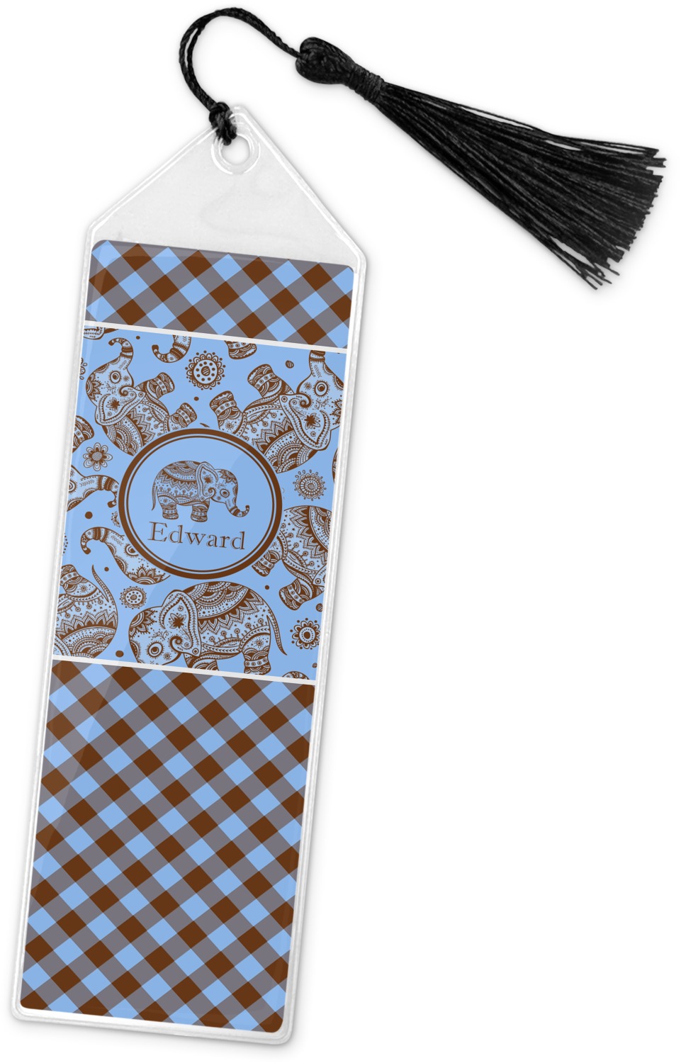 Your personalized bookmark is made of a sturdy, clear vinyl, and is approximately 7.5" x 2.25". We display your personalization on vinyl inserts that are placed on both sides. Accompanying each book marker is a black, fringe tassel that attaches to the reinforced, triangular header.