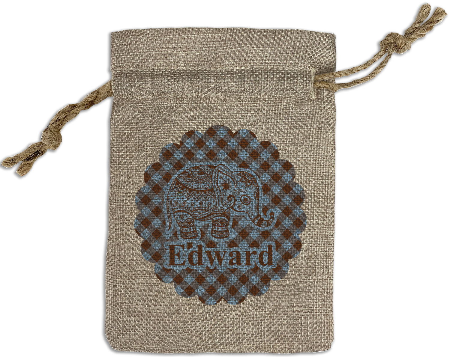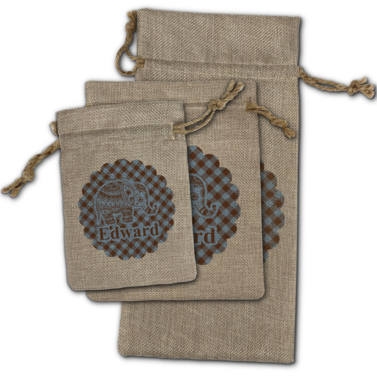 We sell our Burlap Gift Bags in 3 variant sized bags. Made with burlap polyester, each personalized bag can be secured with a twine drawstring pull. Your custom design is available to print on one side or both sides - completely up to you! The sizes of the bags measure approximately 4.5" x 6.5" for the smallest size, 6.5" x 8.0" for the medium size, and 6.5" x 13.5" for the large-sized bag.