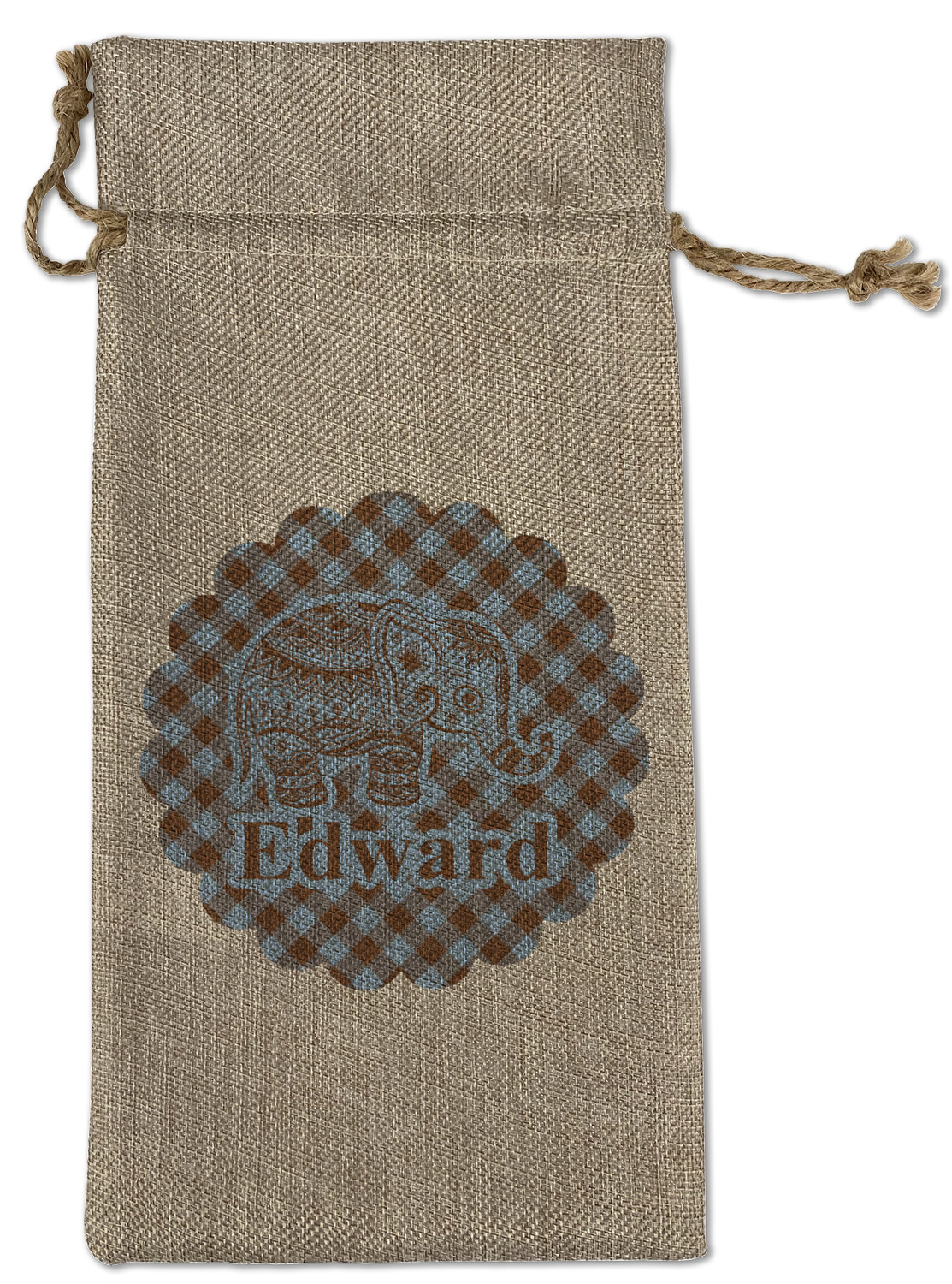 We chose the angled gingham for the top and bottom, but you have the choice of straight gingham or any other pattern in our system that you like. Our baby elephant pattern are available in 3 different styles - we chose style 2. We opted not to have a ribbon and chose a simple round label with a graphic of the elephant and the personalization below the elephant graphic.