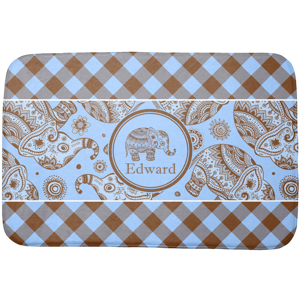 We chose the angled gingham for the top and bottom, but you have the choice of straight gingham or any other pattern in our system that you like. Our baby elephant pattern are available in 3 different styles - we chose style 2. We opted not to have a ribbon and chose a simple round label with a graphic of the elephant and the personalization below the elephant graphic.