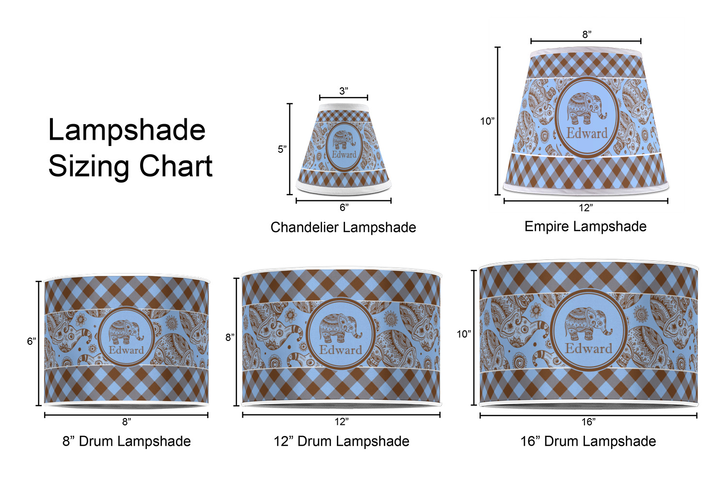Our customized lamp shades also come in 3 different sizes: 8", 12" and 16", measuring at 8" in diameter by 6" tall, 12" in diameter by 8" tall, and 16" in diameter by 10" tall, respectively.