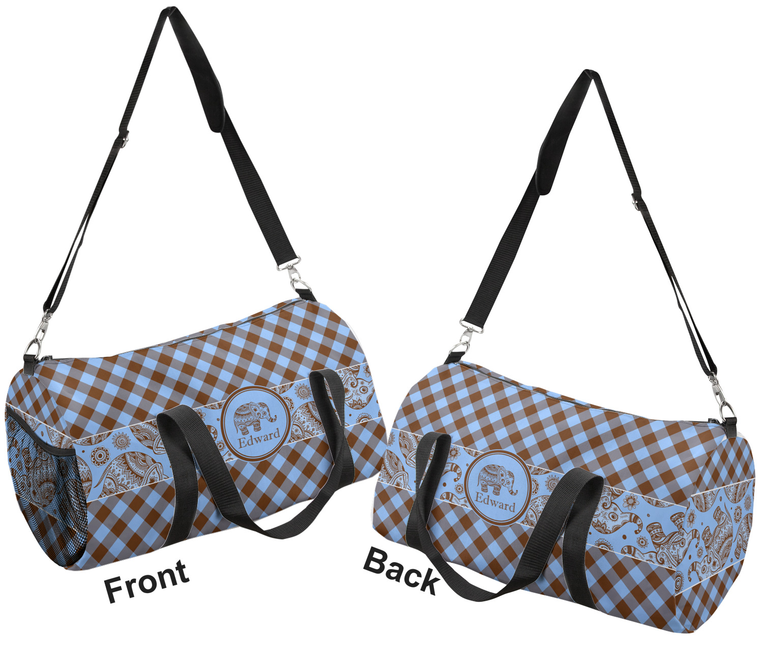 This duffle is a sturdy bag made of a canvas material. It comes in two sizes: Small (19"W x 9.5"H x 9.5"D) and Large (23"W x 12"H x 12"D). The bag is a cylindrical shape with a black adjustable strap and two handles. On one side is an elastic pouch to put a waterbottle or other small item. Your product will be sublimated with your design and is able to be designed on the front, back, and sides. Be sure to remember that the straps may cut into parts of your design if you upload your own artwork.