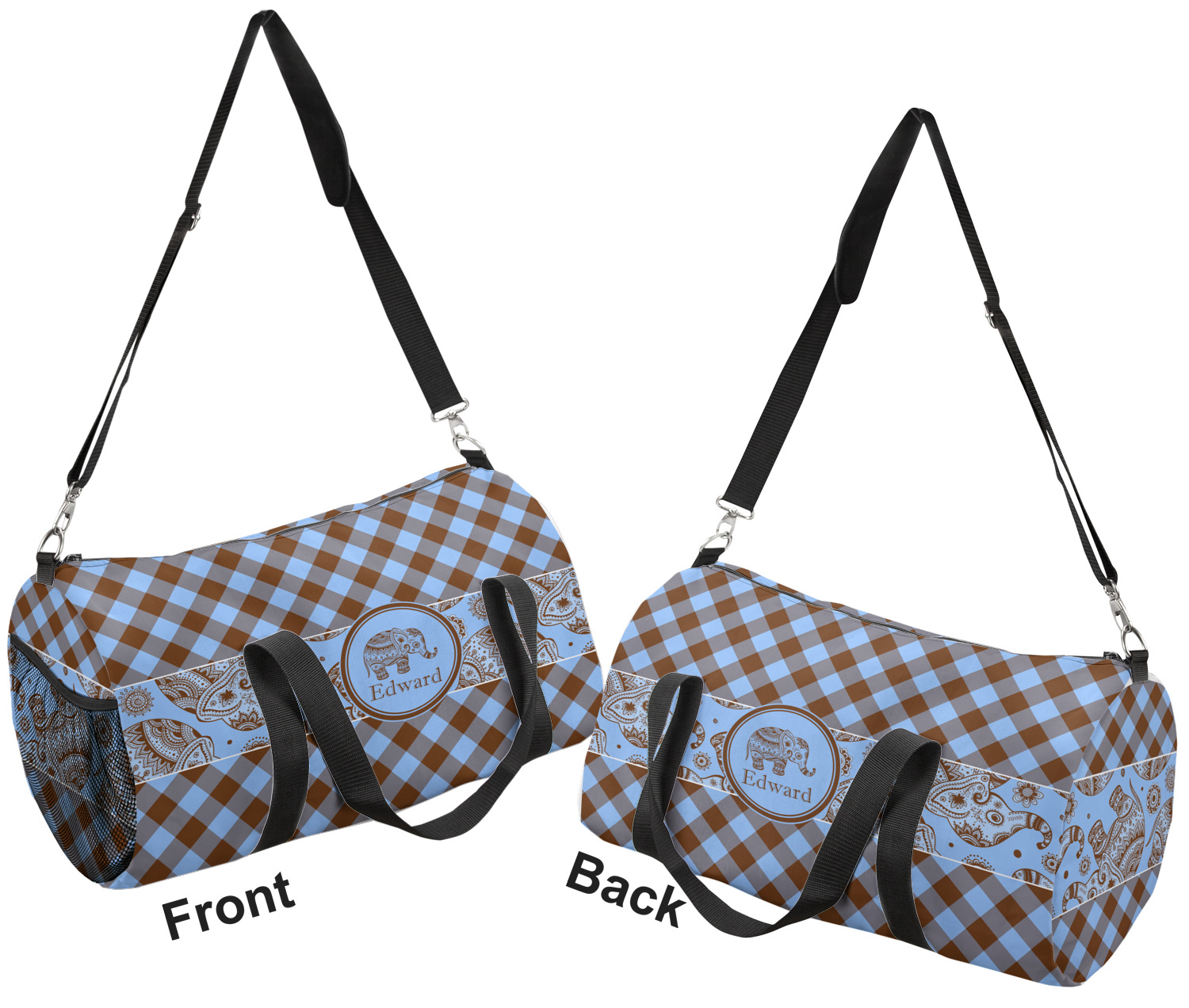 This duffle is a sturdy bag made of a canvas material. It comes in two sizes: Small (19"W x 9.5"H x 9.5"D) and Large (23"W x 12"H x 12"D). The bag is a cylindrical shape with a black adjustable strap and two handles. On one side is an elastic pouch to put a waterbottle or other small item. Your product will be sublimated with your design and is able to be designed on the front, back, and sides. Be sure to remember that the straps may cut into parts of your design if you upload your own artwork.