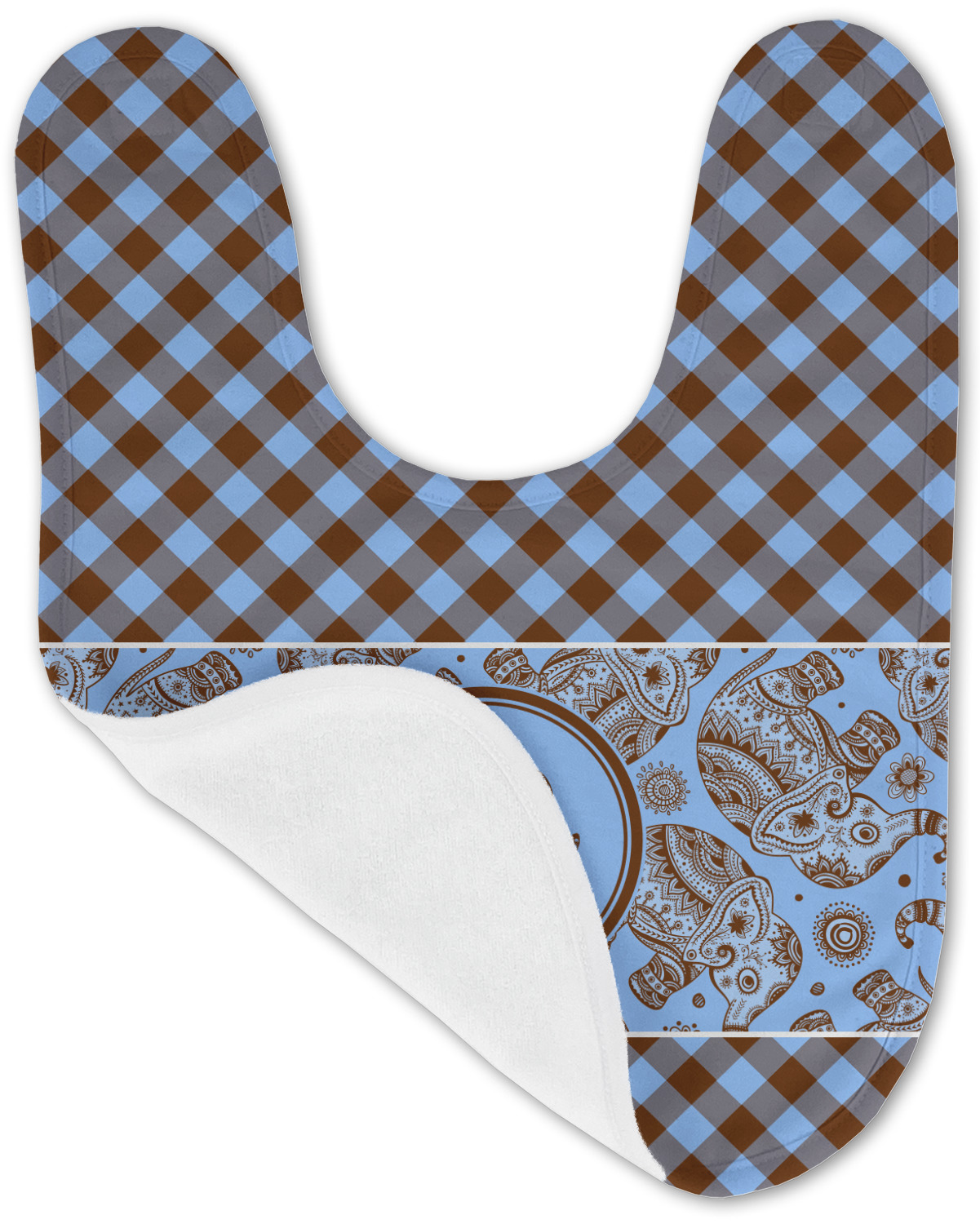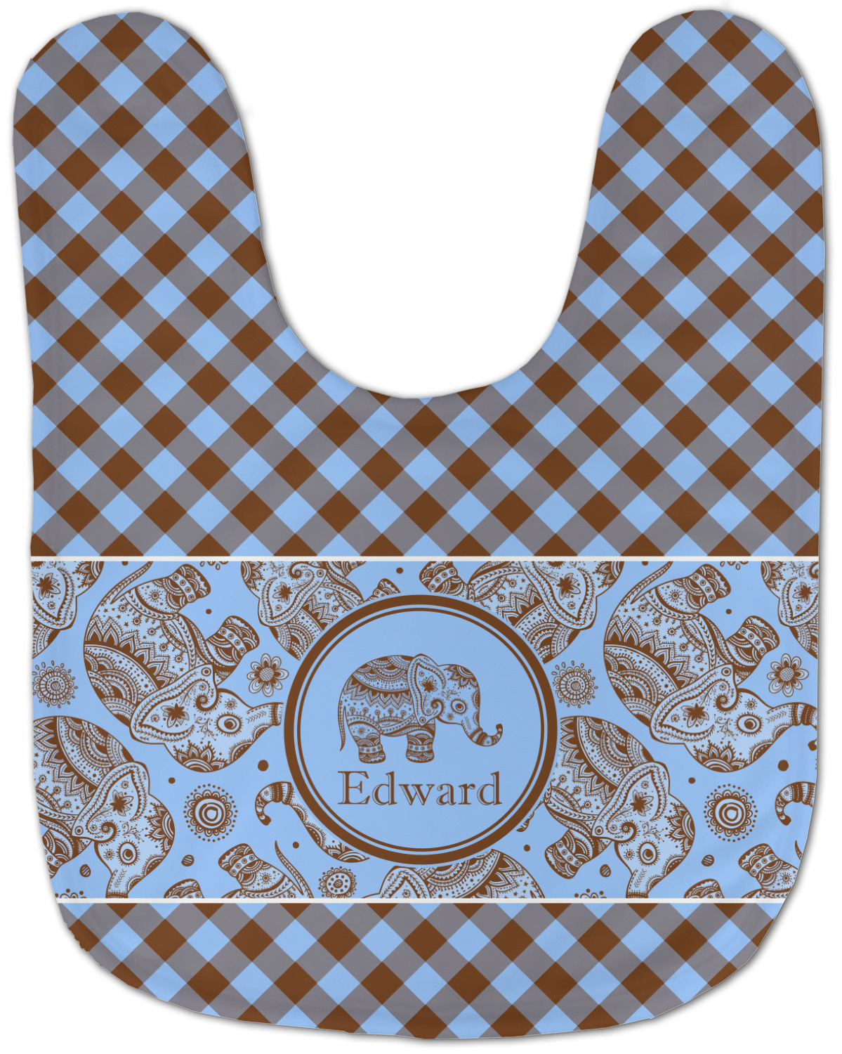 We chose the angled gingham for the top and bottom, but you have the choice of straight gingham or any other pattern in our system that you like. Our baby elephant pattern are available in 3 different styles - we chose style 2. We opted not to have a ribbon and chose a simple round label with a graphic of the elephant and the personalization below the elephant graphic.