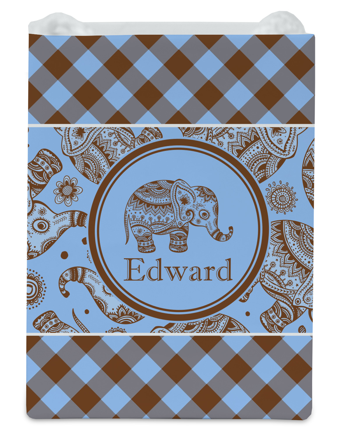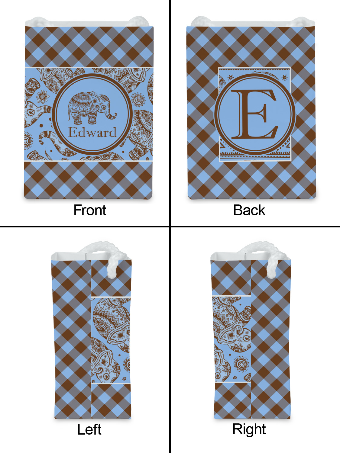 We chose the angled gingham for the top and bottom, but you have the choice of straight gingham or any other pattern in our system that you like. Our baby elephant pattern are available in 3 different styles - we chose style 2. We opted not to have a ribbon and chose a simple round label with a graphic of the elephant and the personalization below the elephant graphic.