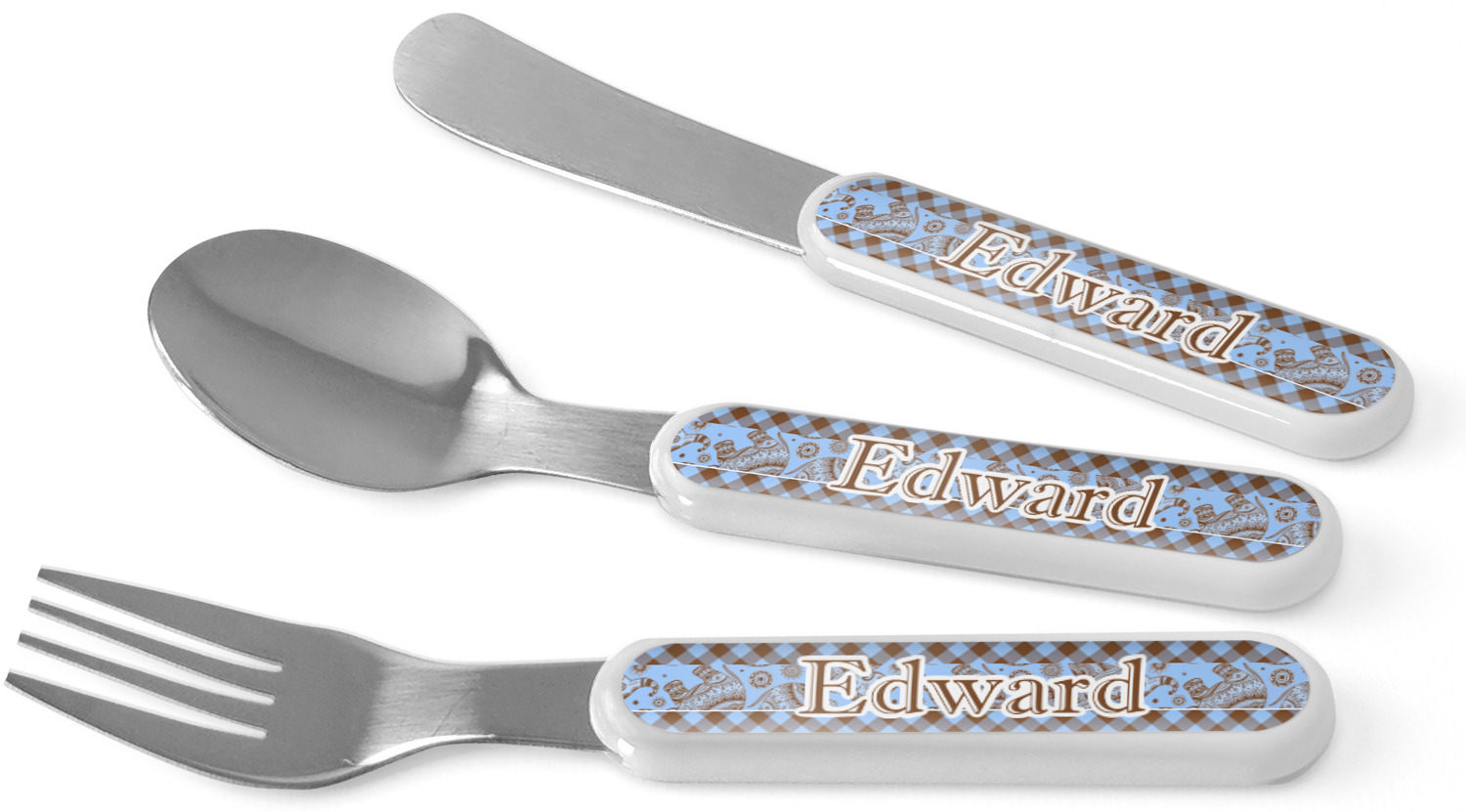 This set of kids' silverware includes a 5.5 inch spoon, fork, and knife, catered to your little one's needs. The prongs of this fork are flat and dull, while our spoon is small enough for tiny mouths, and the dullness of the knife itself resembles a butter knife, at most. These kids' utensils are made of stainless steel, while the handles are crafted from a durable plastic that will withstand the energy and use of your young one. We print your customization across the handles, making the cutlery set unique to your child only.