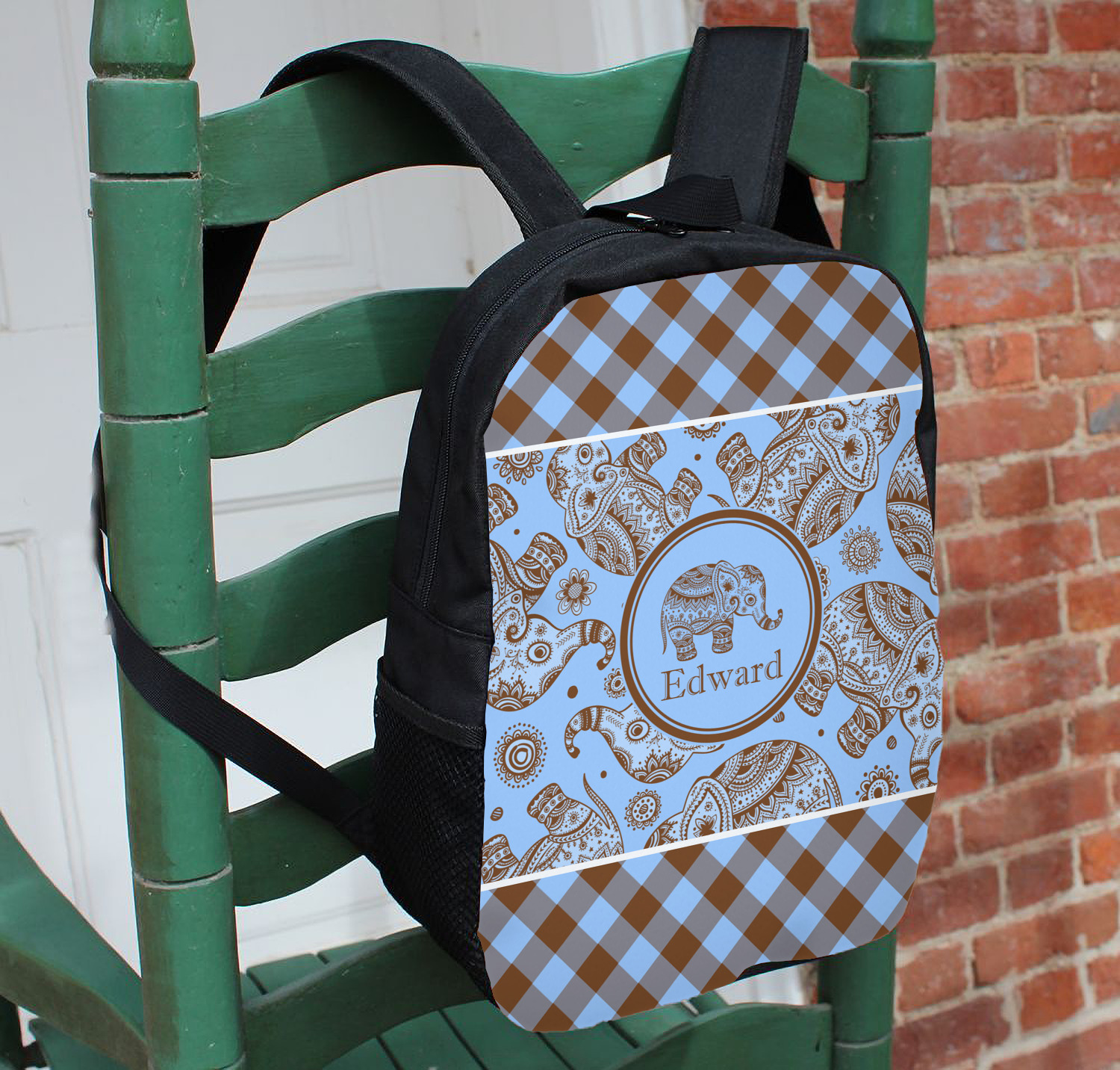 We chose the angled gingham for the top and bottom, but you have the choice of straight gingham or any other pattern in our system that you like. Our baby elephant pattern are available in 3 different styles - we chose style 2. We opted not to have a ribbon and chose a simple round label with a graphic of the elephant and the personalization below the elephant graphic.