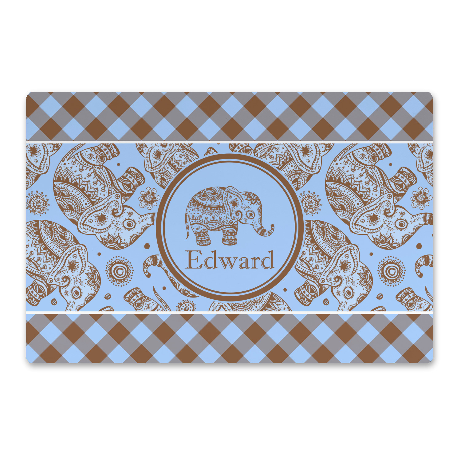 We chose the angled gingham for the top and bottom, but you have the choice of straight gingham or any other pattern in our system that you like. Our baby elephant pattern are available in 3 different styles - we chose style 2. We opted not to have a ribbon and chose a simple round label with a graphic of the elephant and the personalization below the elephant graphic.