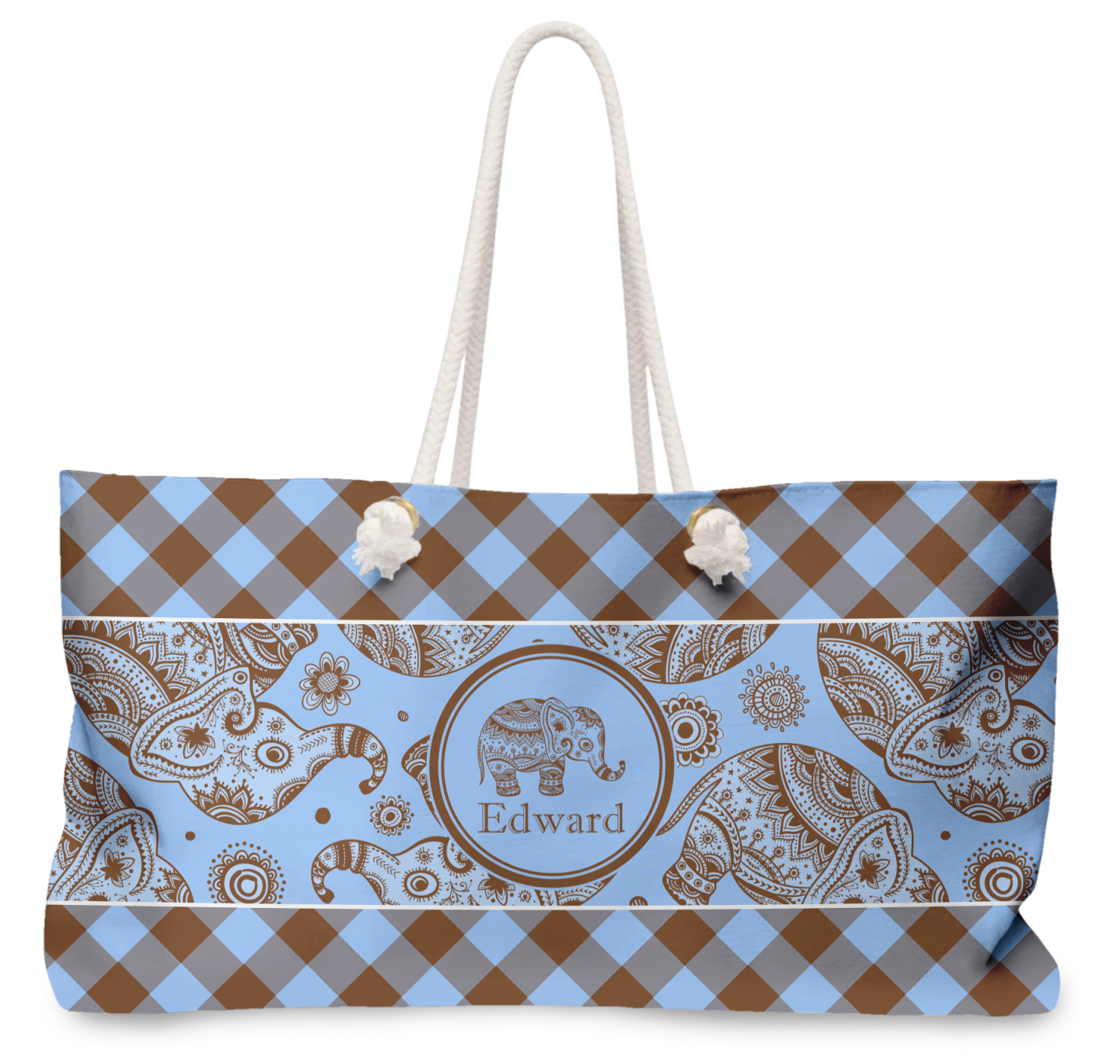 Our oversized weekender tote with rope handles is perfect for your weekend at the beach or on the town. This large tote are 24" W X 13" H, with a 5" gusset and a 27" thick rope handles with a knot that is put through a grommeted brass hole.