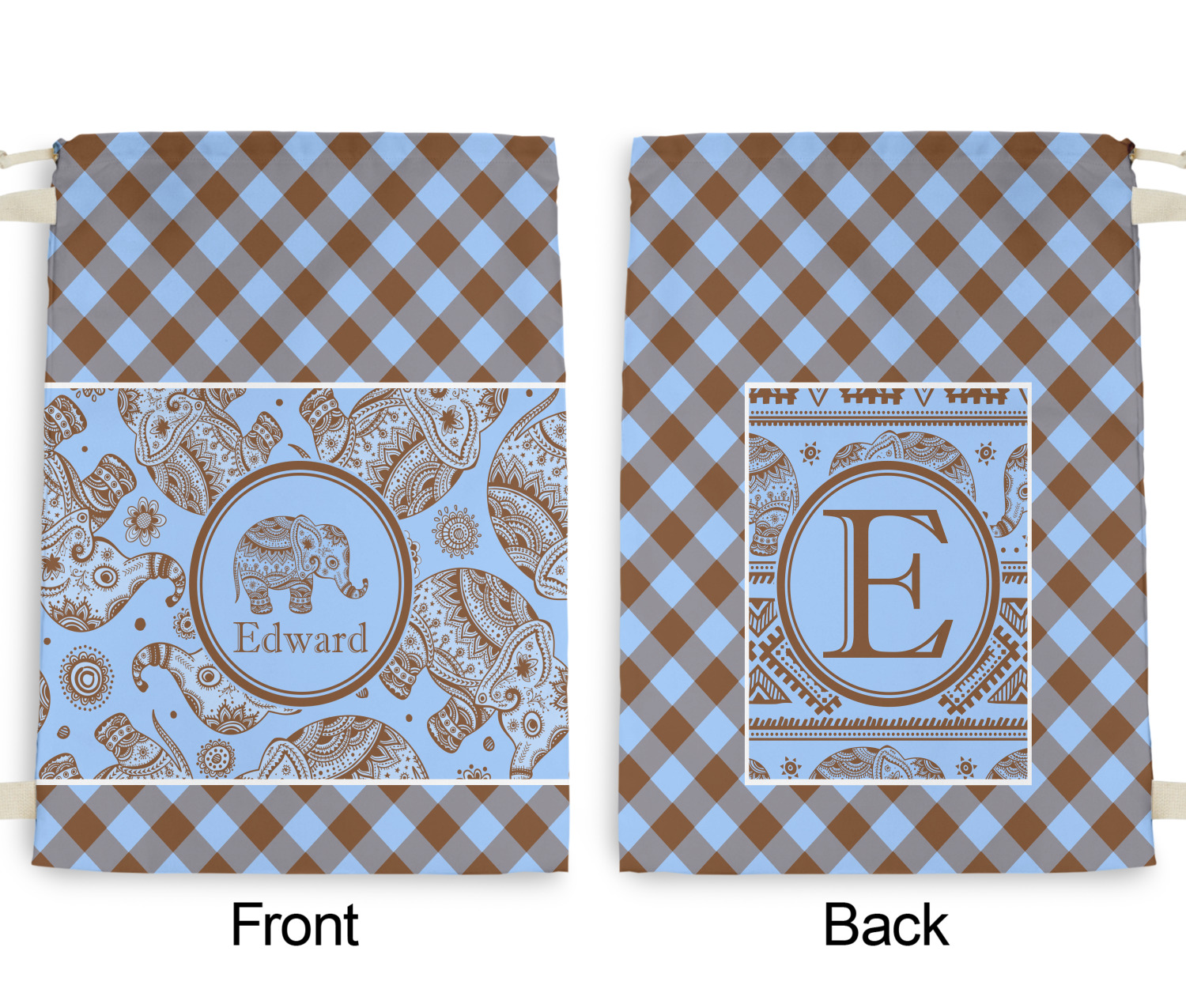 We chose the angled gingham for the top and bottom, but you have the choice of straight gingham or any other pattern in our system that you like. Our baby elephant pattern are available in 3 different styles - we chose style 2. We opted not to have a ribbon and chose a simple round label with a graphic of the elephant and the personalization below the elephant graphic.
