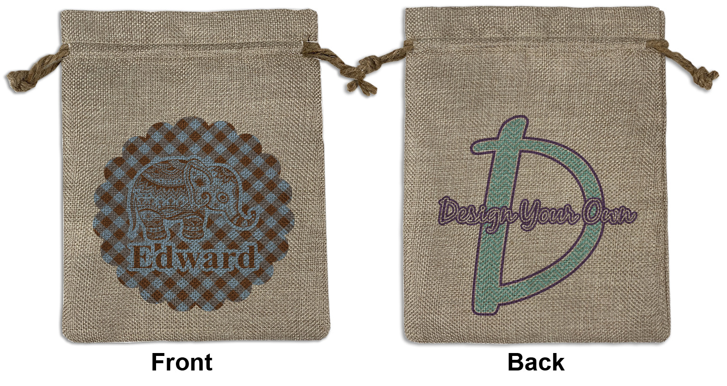We sell our Burlap Gift Bags in 3 variant sized bags. Made with burlap polyester, each personalized bag can be secured with a twine drawstring pull. Your custom design is available to print on one side or both sides - completely up to you! The sizes of the bags measure approximately 4.5" x 6.5" for the smallest size, 6.5" x 8.0" for the medium size, and 6.5" x 13.5" for the large-sized bag.