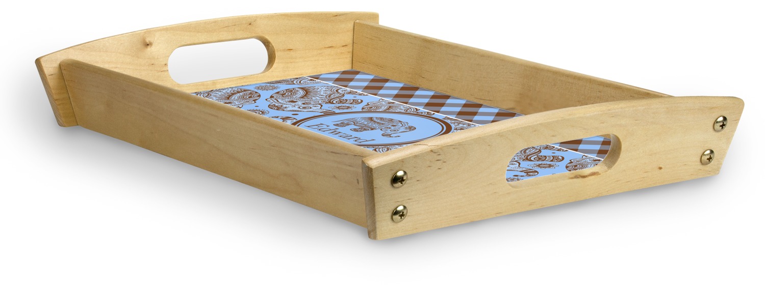 This serving tray with handles features square edges and two rounded sides, creating a very modern look. Each side is fabricated from a beautifully cut, natural wood. The bottom of the interior of the tray displays your customized design in bright, vibrant color. The tray is sold in both a black color and a natural wood look. Each variation of the wood serving tray has two sizes: Small, which is 14" x 10" x 2.25", and Large, which is 19.5" x 13.5" x 2.75".