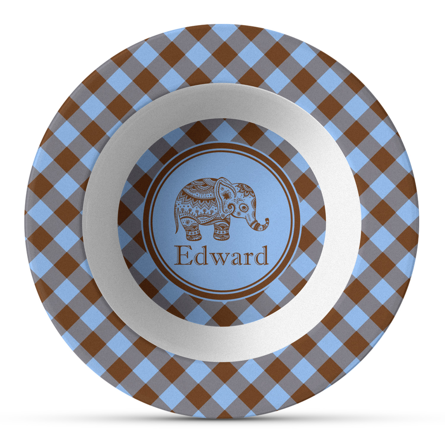 We chose the angled gingham for the top and bottom, but you have the choice of straight gingham or any other pattern in our system that you like. Our baby elephant pattern are available in 3 different styles - we chose style 2. We opted not to have a ribbon and chose a simple round label with a graphic of the elephant and the personalization below the elephant graphic.