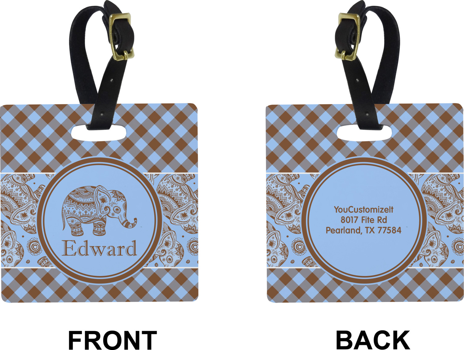 These personalized bag tags are sold in a variety of shapes, so that you may find the product that meets your vision exactly. We sell a round luggage tag, which measures at approximately 4" x 4". Our square luggage tag is about 3.5" x 3.5", while our rectangular version is 2.75" x 4 ".