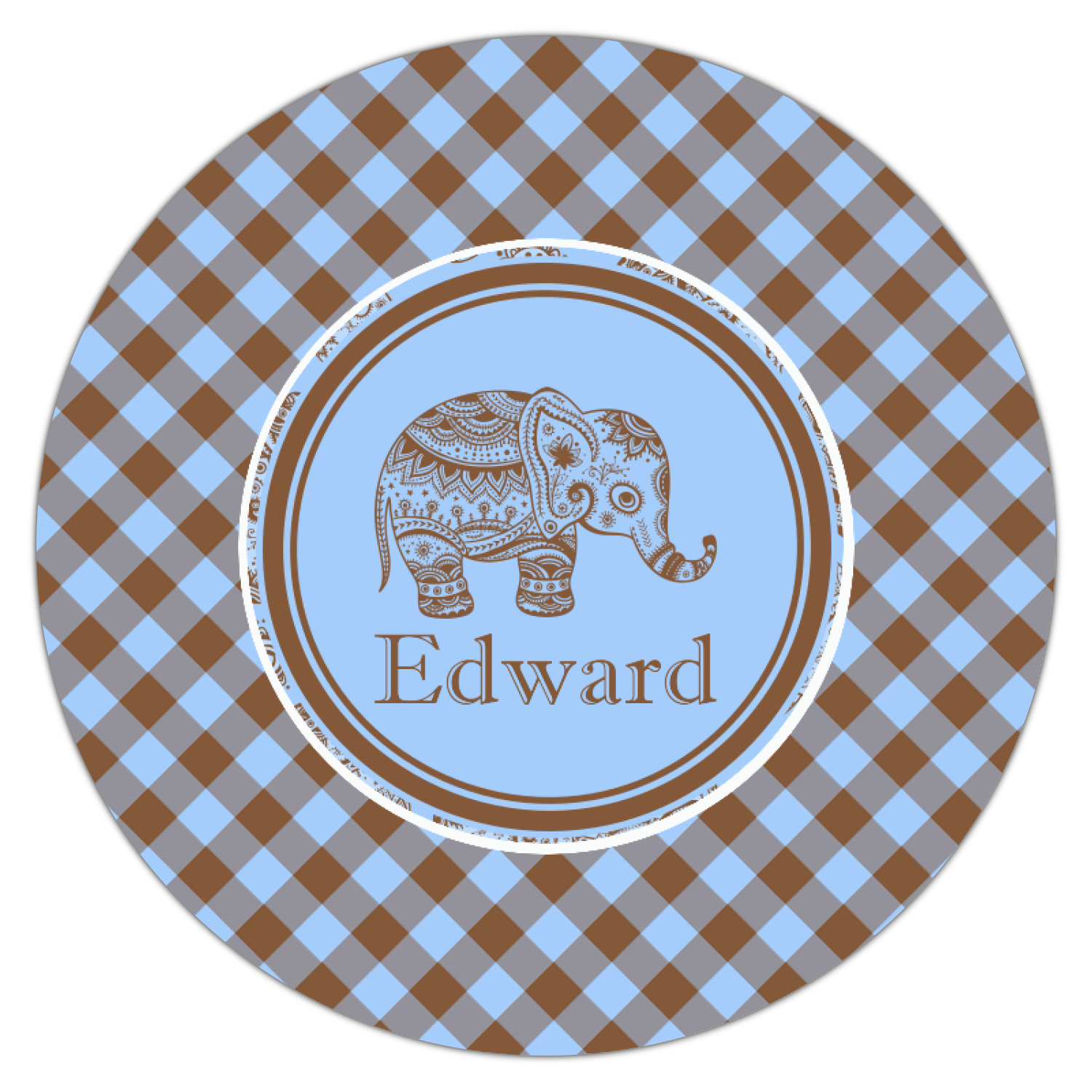 We chose the angled gingham for the top and bottom, but you have the choice of straight gingham or any other pattern in our system that you like. Our baby elephant pattern are available in 3 different styles - we chose style 2. We opted not to have a ribbon and chose a simple round label with a graphic of the elephant and the personalization below the elephant graphic.