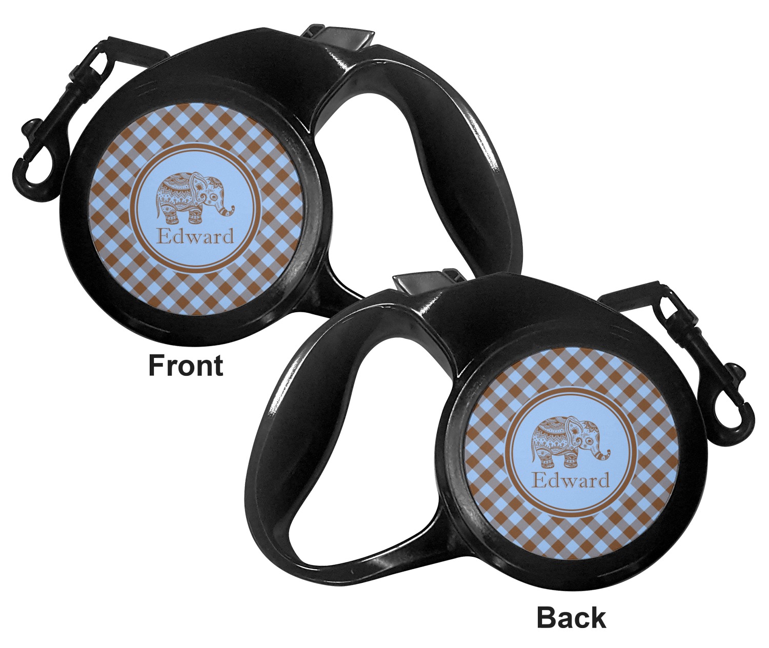 The leash's plastic handle is accommodating of your grip and displays your customization on both sides. The dog leash also features the traditional bolt snap clip, for easy fastening to your dog's collar. The leash and leash handle themselves are both black in color.
