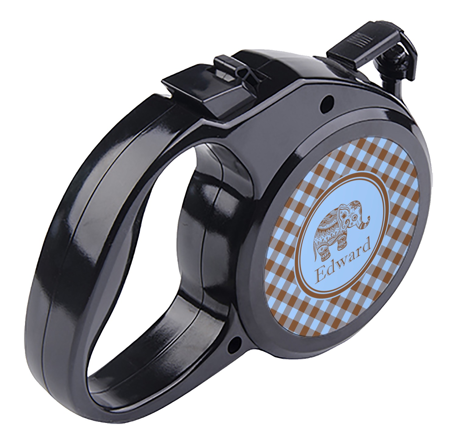 The leash's plastic handle is accommodating of your grip and displays your customization on both sides. The dog leash also features the traditional bolt snap clip, for easy fastening to your dog's collar. The leash and leash handle themselves are both black in color.