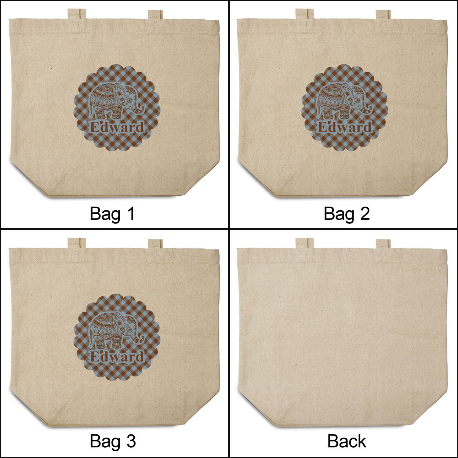 We chose the angled gingham for the top and bottom, but you have the choice of straight gingham or any other pattern in our system that you like. Our baby elephant pattern are available in 3 different styles - we chose style 2. We opted not to have a ribbon and chose a simple round label with a graphic of the elephant and the personalization below the elephant graphic.