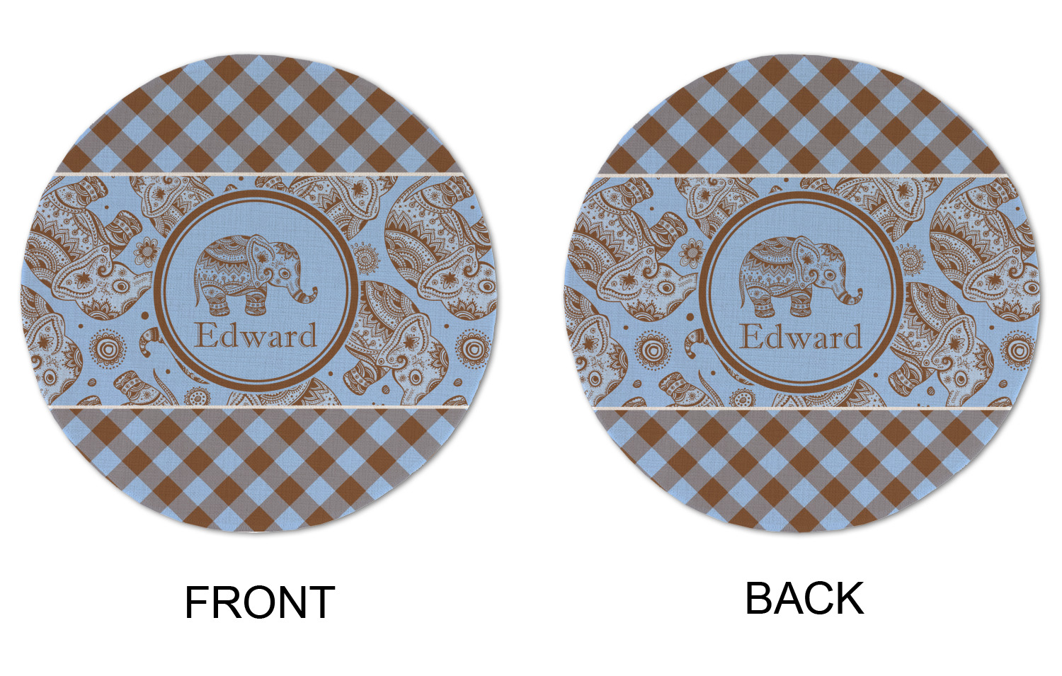 We chose the angled gingham for the top and bottom, but you have the choice of straight gingham or any other pattern in our system that you like. Our baby elephant pattern are available in 3 different styles - we chose style 2. We opted not to have a ribbon and chose a simple round label with a graphic of the elephant and the personalization below the elephant graphic.