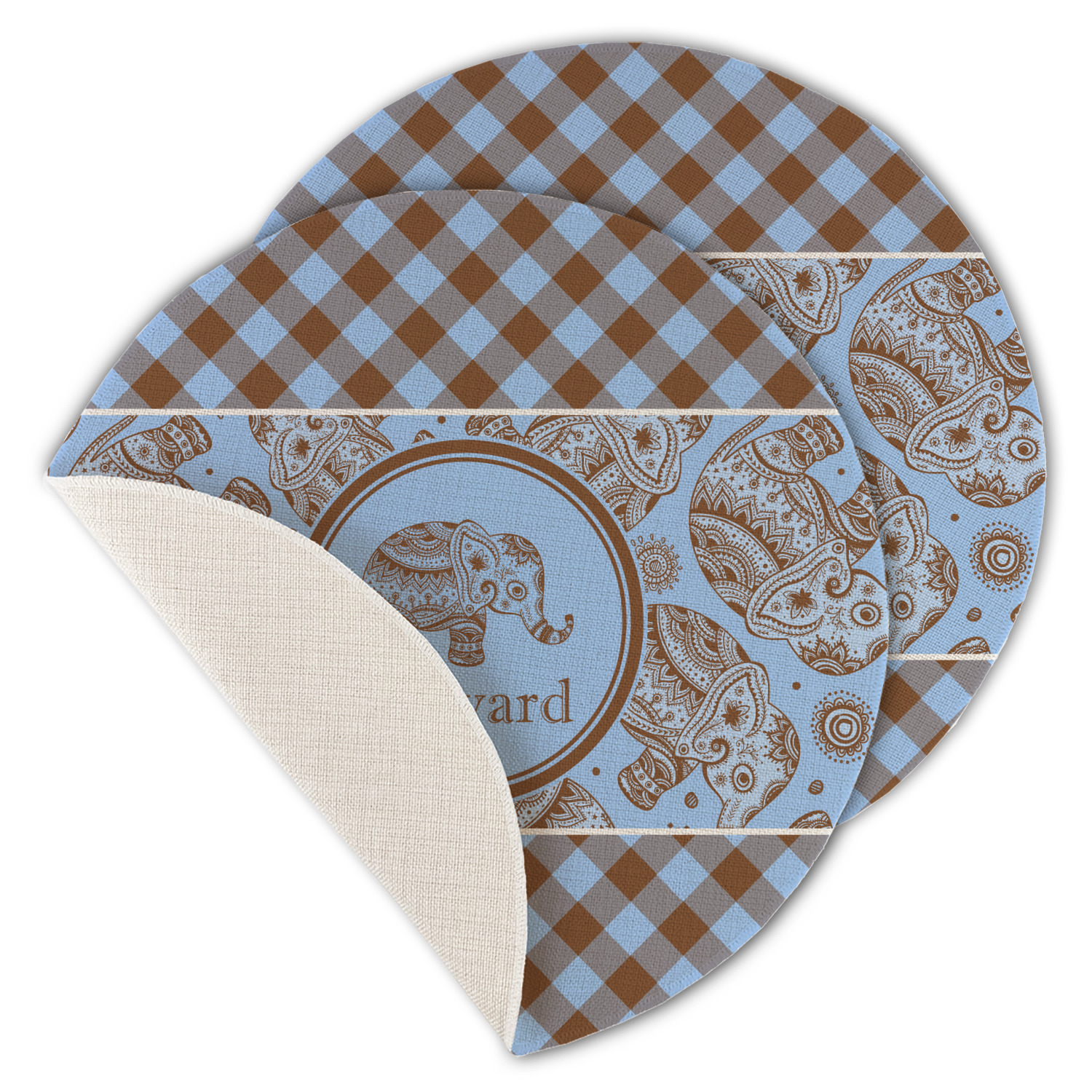 We chose the angled gingham for the top and bottom, but you have the choice of straight gingham or any other pattern in our system that you like. Our baby elephant pattern are available in 3 different styles - we chose style 2. We opted not to have a ribbon and chose a simple round label with a graphic of the elephant and the personalization below the elephant graphic.