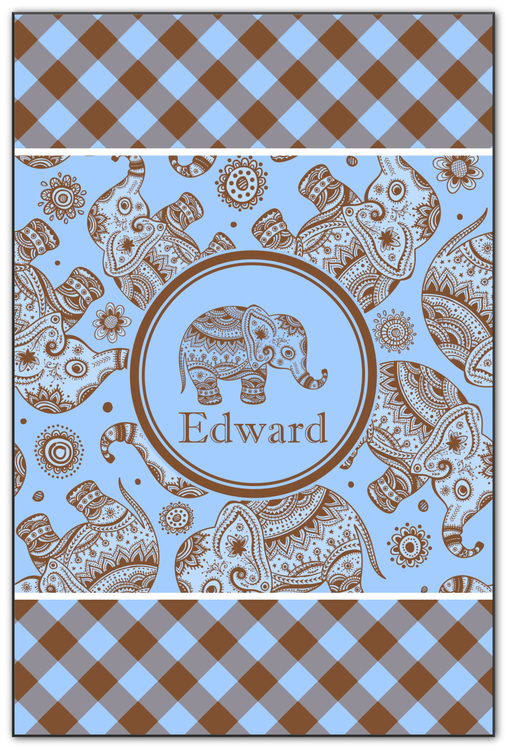 This design with gingham and baby elephants is elegant and versatile. We chose to use baby blue and brown for our colors, however the design is fully recolor-able; so you can change the both the colors to any color combination that you like.