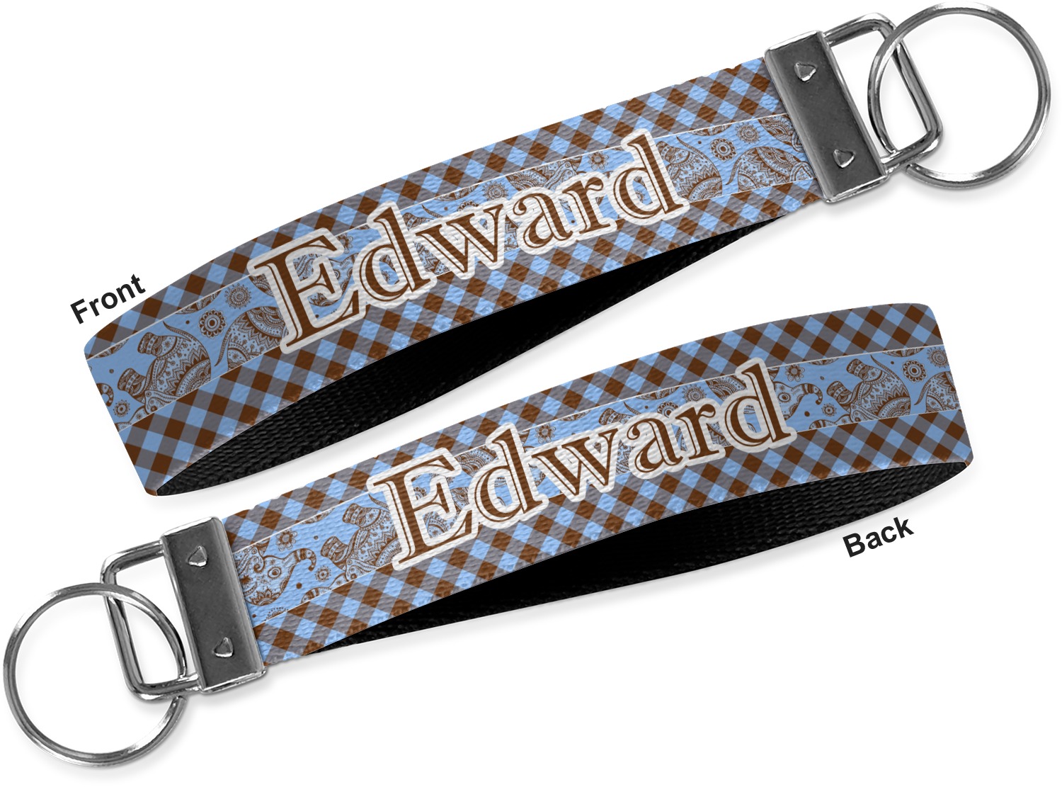 These key fob keychains are made from a polyester weave, right here in the USA. They feature a silver, metal clasp, attached to a round keyring. The piece gives the personalized wristlet a beautiful, finished look. Your customized design is printed on the outside of the keychain strap. We carry these wristlets in two sizes: small, which is 5 inches in width, and large, which is 5.5 inches in width.