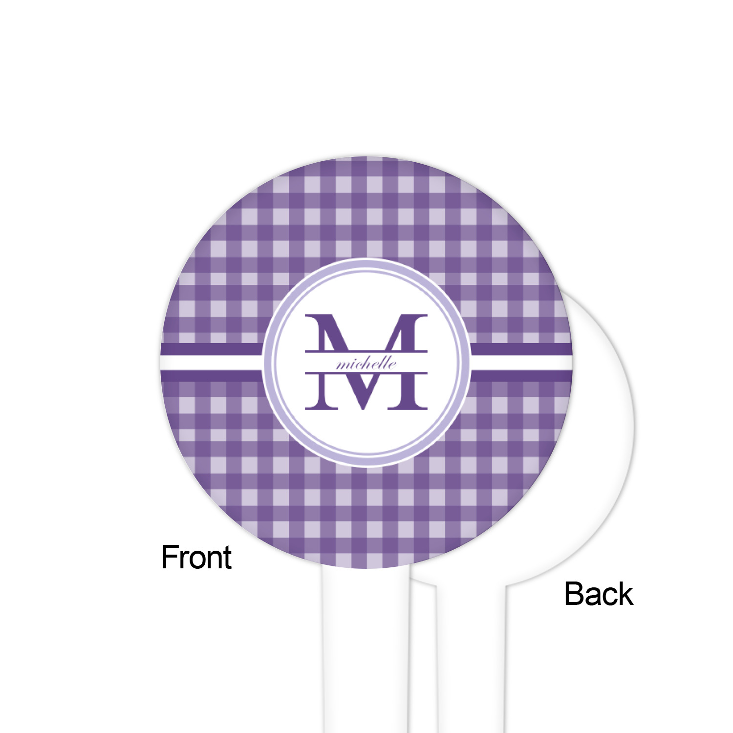 A light and dark wide purple band highlights a classic white circle label that has been exquisitely trimmed in two different shades of purple to showcase your personalization.