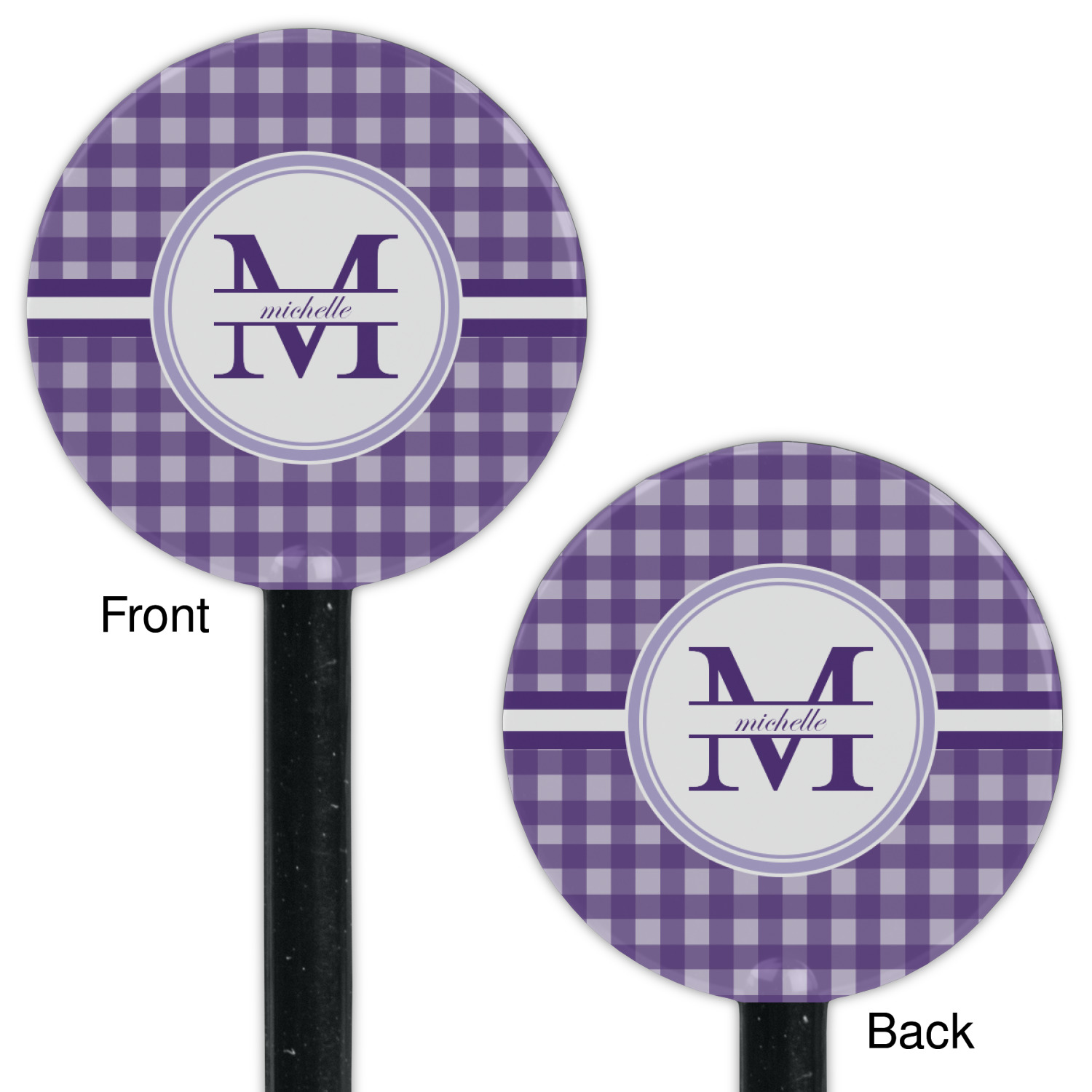 A light and dark wide purple band highlights a classic white circle label that has been exquisitely trimmed in two different shades of purple to showcase your personalization.