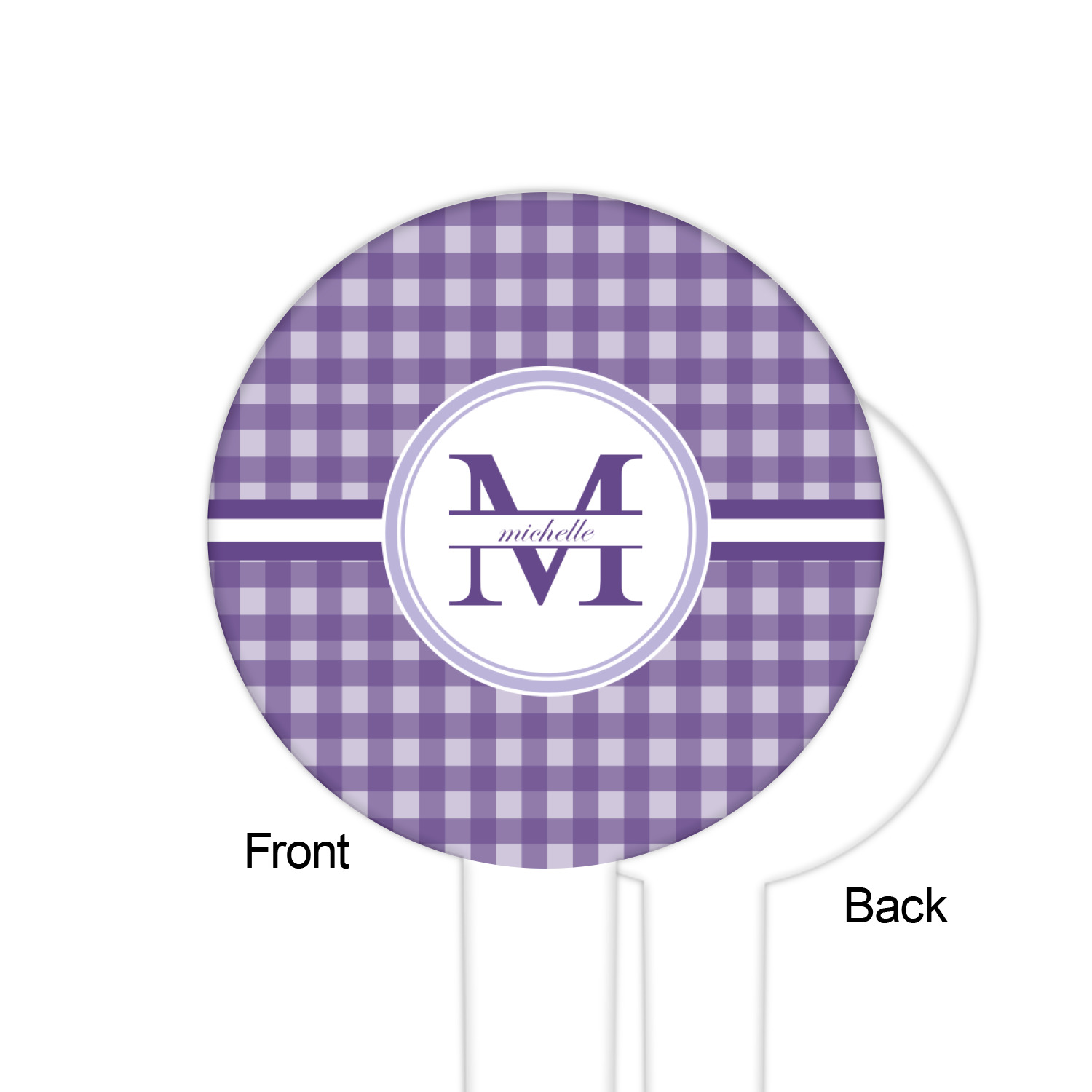 A light and dark wide purple band highlights a classic white circle label that has been exquisitely trimmed in two different shades of purple to showcase your personalization.