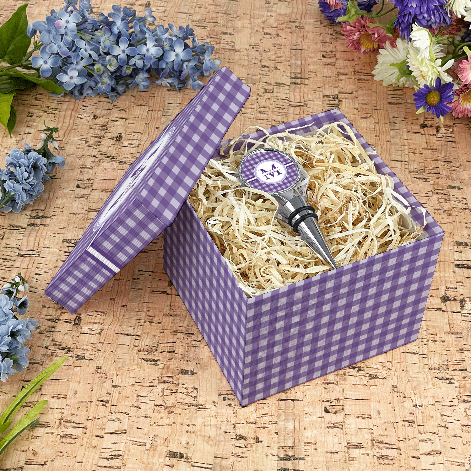 A light and dark wide purple band highlights a classic white circle label that has been exquisitely trimmed in two different shades of purple to showcase your personalization.