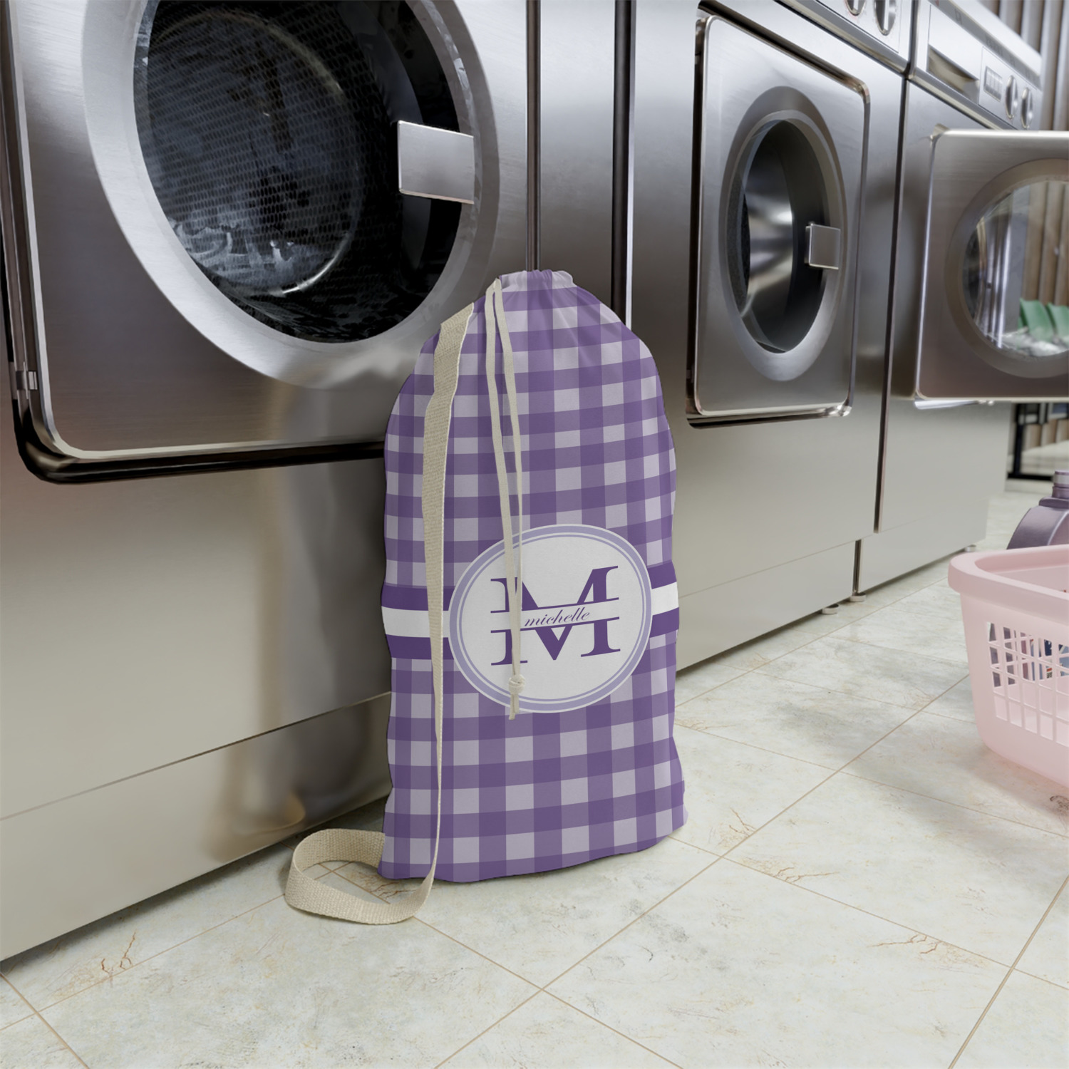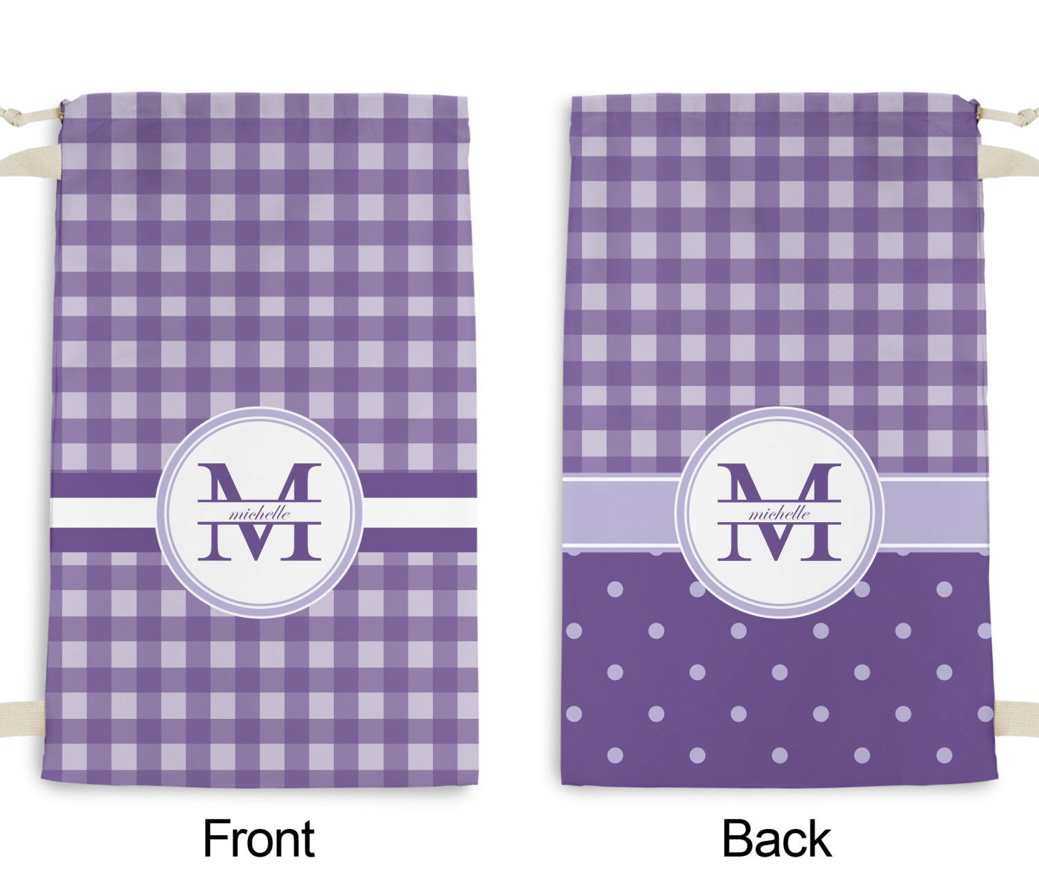 Carry your laundry in style with these customized laundry bags. Available in two sizes, featuring a natural colored woven strap and a cinch cord, these bags hold a lot of clothes or anything else you want to fit in them.