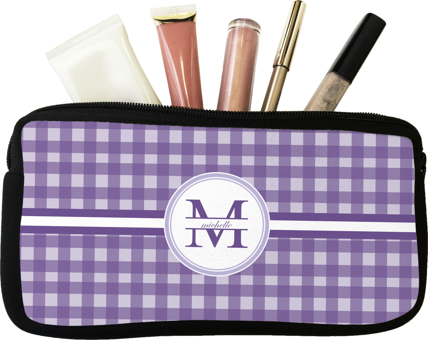 Our personalized makeup bags are available in many different designs, patterns and colors - so you are sure to find one that will love. They are made of neoprene (same material as wet-suits) and thus are water resistant, so spillages in your makeup bag will not end up all over you purse. They are customized on one side and are black on the other side and the zipper is black as well.