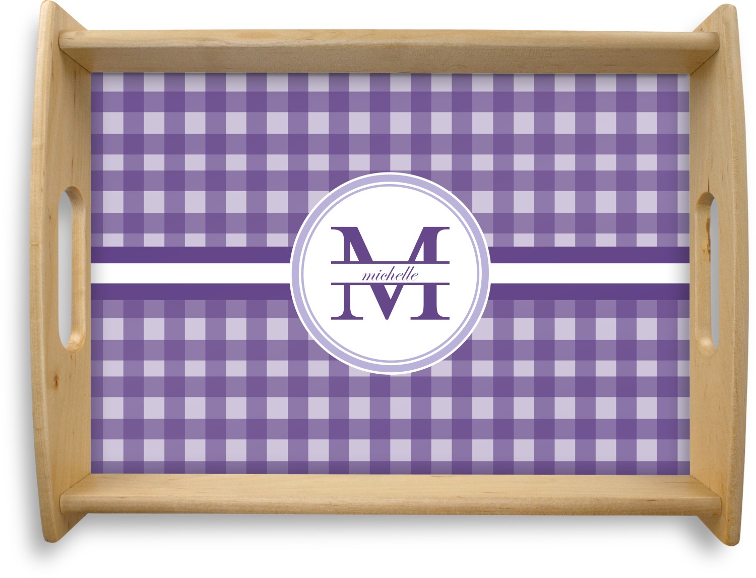 This serving tray with handles features square edges and two rounded sides, creating a very modern look. Each side is fabricated from a beautifully cut, natural wood. The bottom of the interior of the tray displays your customized design in bright, vibrant color. The tray is sold in both a black color and a natural wood look. Each variation of the wood serving tray has two sizes: Small, which is 14" x 10" x 2.25", and Large, which is 19.5" x 13.5" x 2.75".