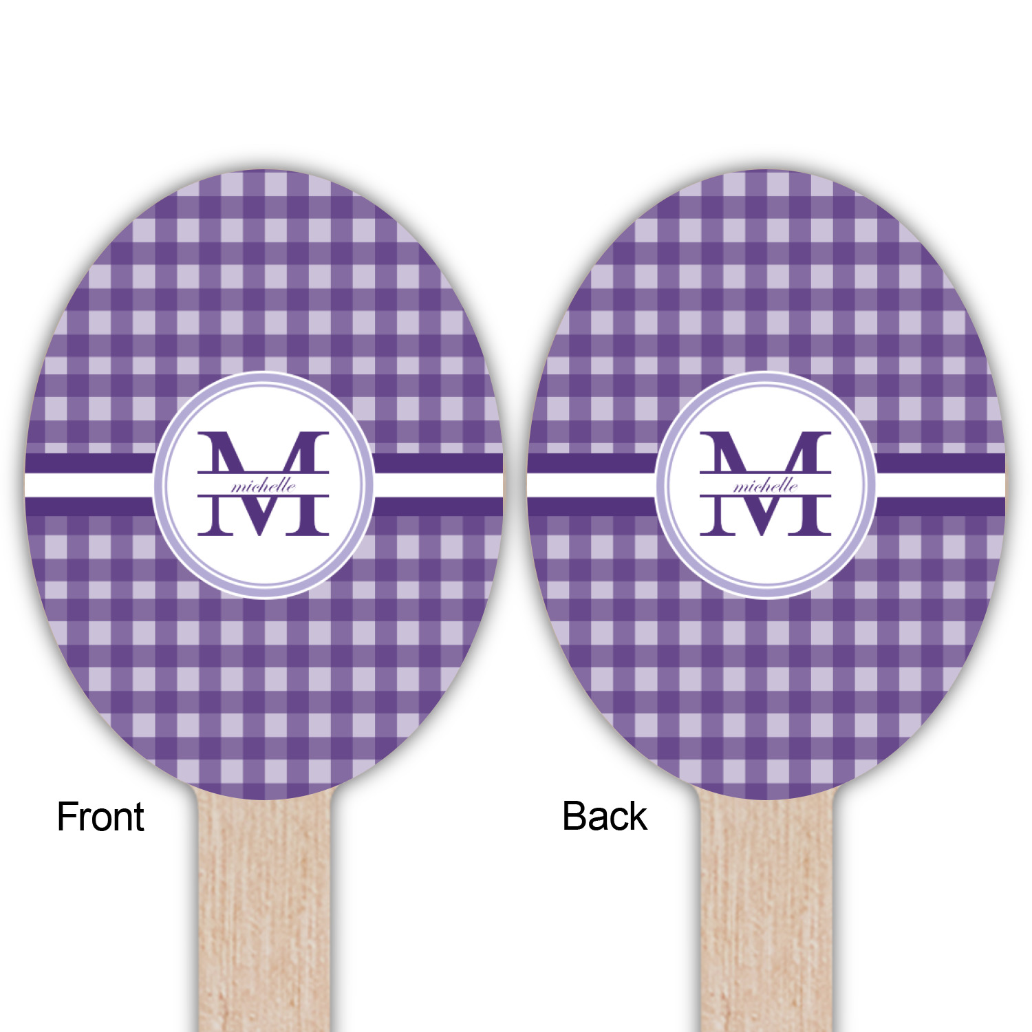 A light and dark wide purple band highlights a classic white circle label that has been exquisitely trimmed in two different shades of purple to showcase your personalization.