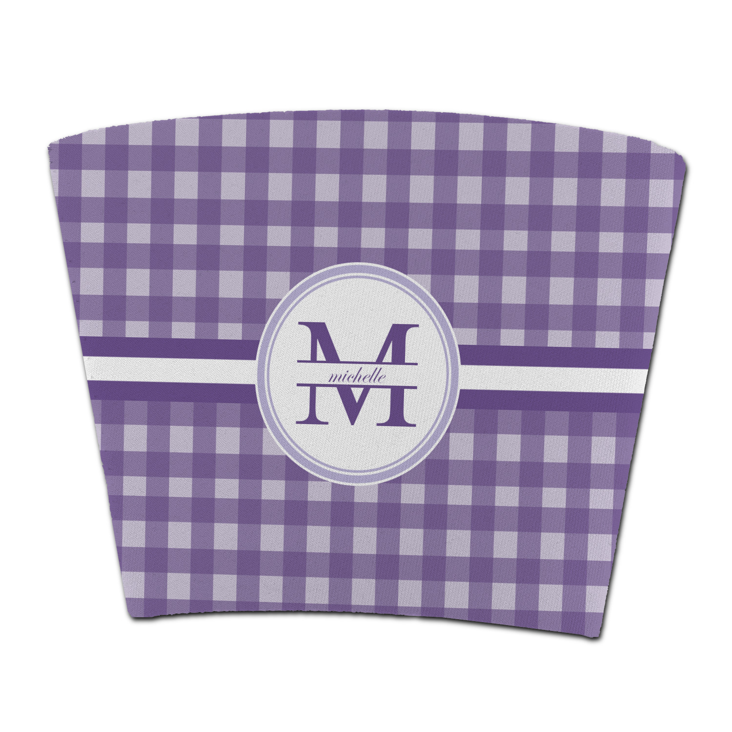 A light and dark wide purple band highlights a classic white circle label that has been exquisitely trimmed in two different shades of purple to showcase your personalization.