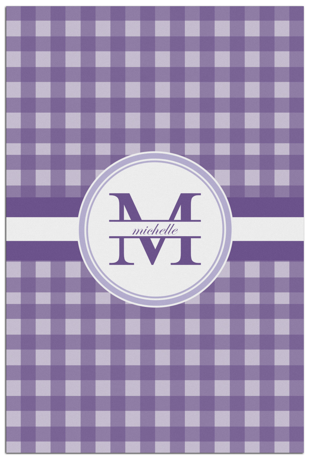 A light and dark wide purple band highlights a classic white circle label that has been exquisitely trimmed in two different shades of purple to showcase your personalization.
