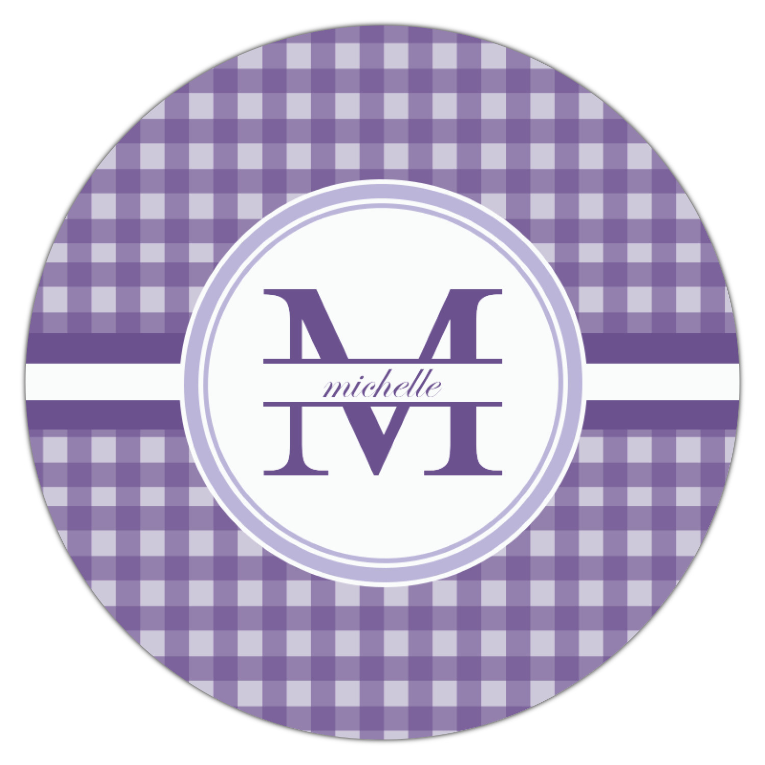 A light and dark wide purple band highlights a classic white circle label that has been exquisitely trimmed in two different shades of purple to showcase your personalization.