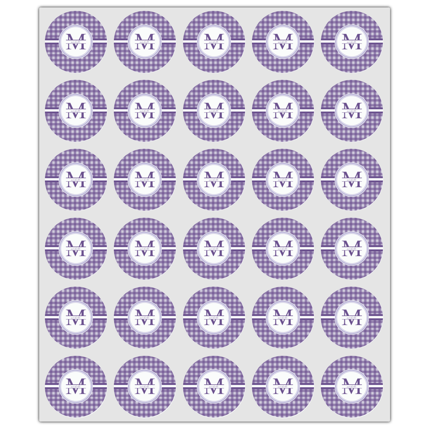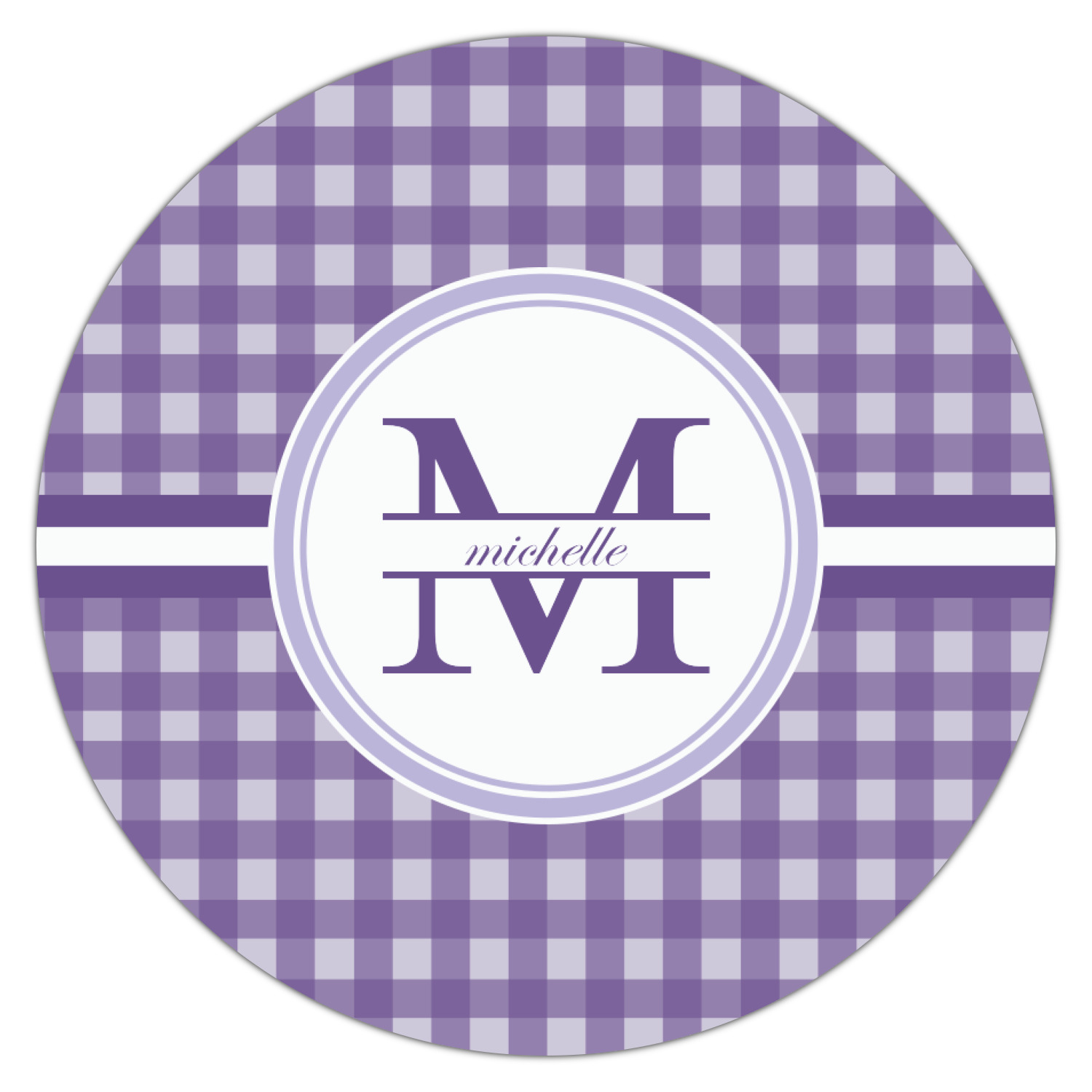 A light and dark wide purple band highlights a classic white circle label that has been exquisitely trimmed in two different shades of purple to showcase your personalization.